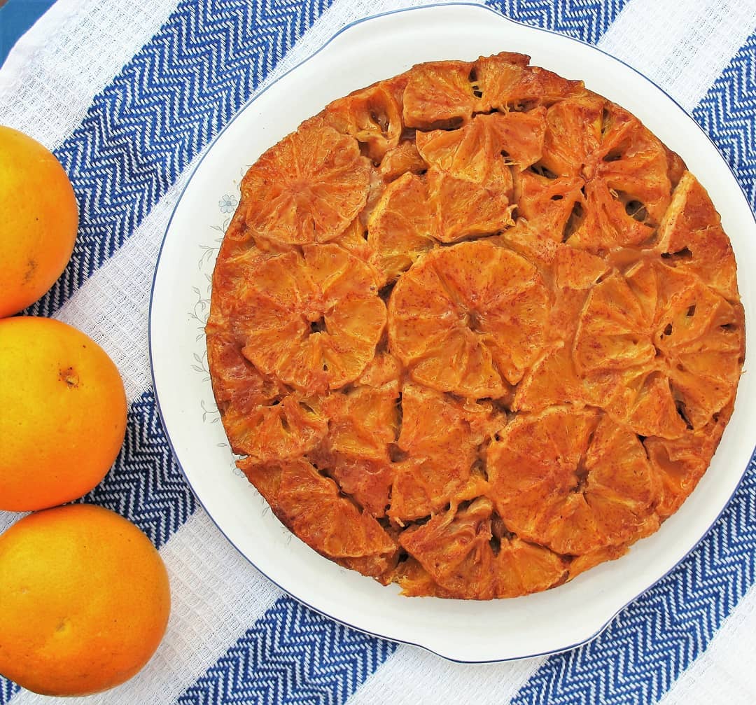 Precalentar el horno a 180°. Preparar un molde de 22 cm untándolo con aceite y espolvoreando con abundante azúcar y canela. Pelar los cítricos y cortarlos en rodajas de 1 cm de espesor aproximadamente. Colocar las rodajas cubriendo toda la base del molde, lo más apretadas posible: si quedan huecos o agujeros, completar con trozos más pequeños. Piensen que al cocinarse la fruta se reduce y ocupa menos lugar, no queremos que queden baches.