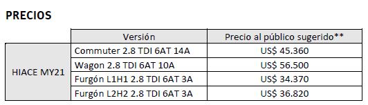 La nueva propuesta de vehículos comerciales de Toyota Hiace posee las siguientes dimensiones: