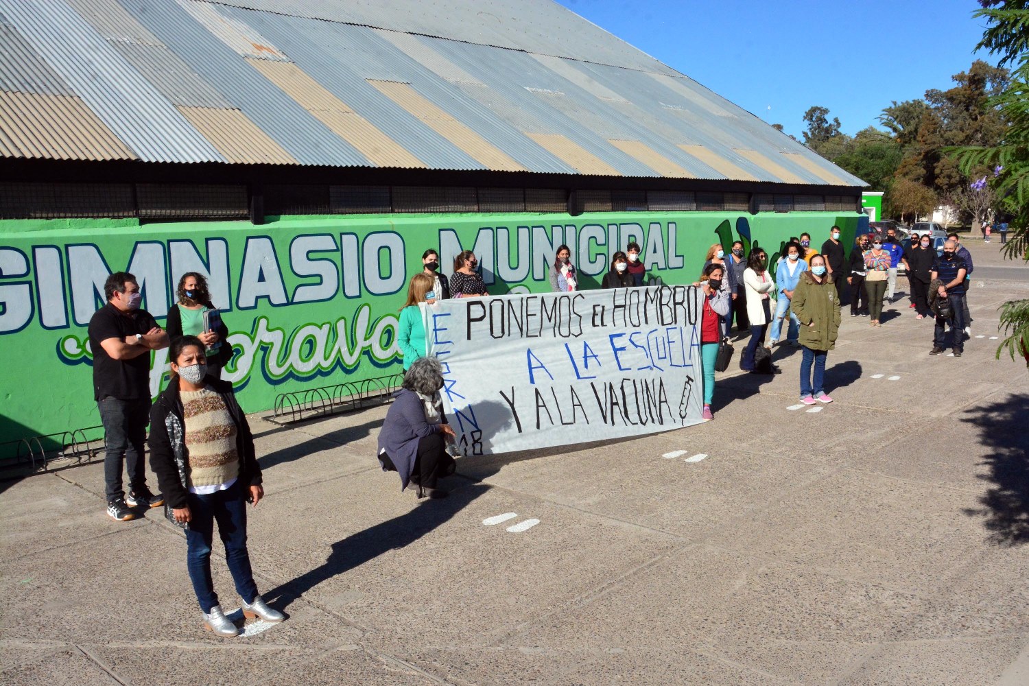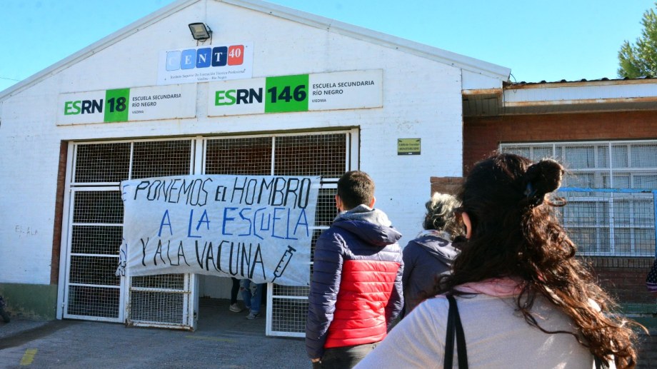 Docentes de la ESRN N° 18 de la capital rionegrina levantó un cartel con la leyenda "Ponemos el hombro a la Escuela y a la Vacuna".