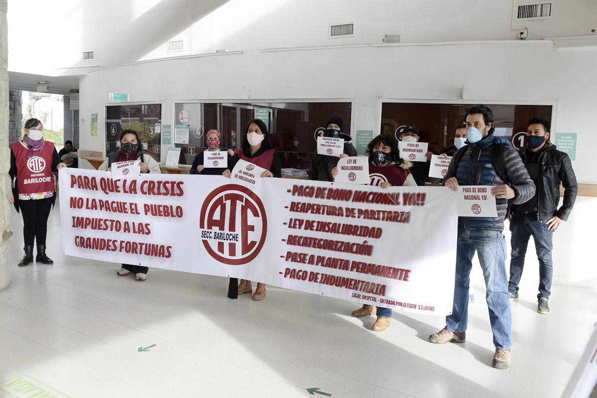 Trabajadores del hospital Ramón Carrillo de Bariloche y dirigentes de ATE se manifestaron hoy con carteles para reclamar el pago del bono de 20.000 pesos que comprometió el Gobierno nacional, el pase a planta permanente y un adicional por indumentaria.