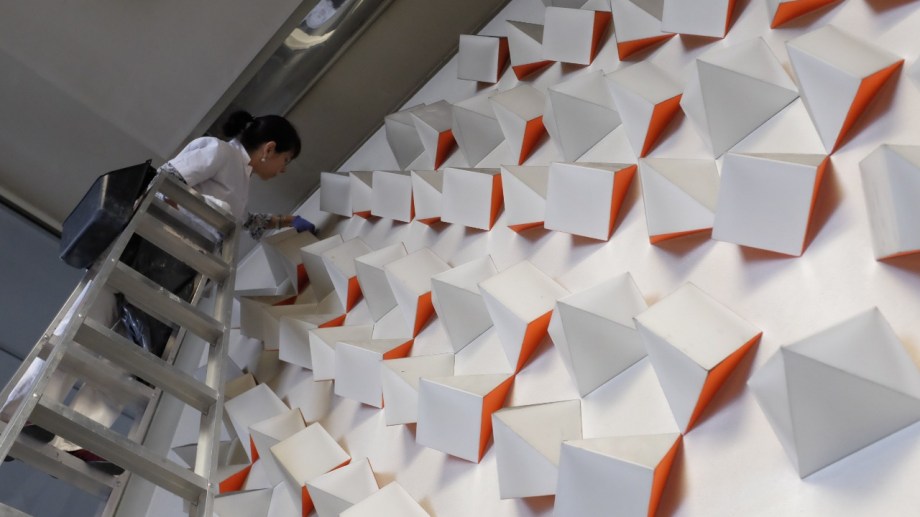 De las cinco obras ubicadas en el hall del edificio, la más afectada fue “Atmósfera cromoplástica”, la monumental obra que Luis Tomasello hizo donde actualmente está emplazada, especialmente para la inauguración del Museo, en 2004. Se trata de un mural realizado con poliedros de chapa pintados a fuego, de color blanco y naranja fluorescente, amurados sobre un soporte de mampostería de color blanco.