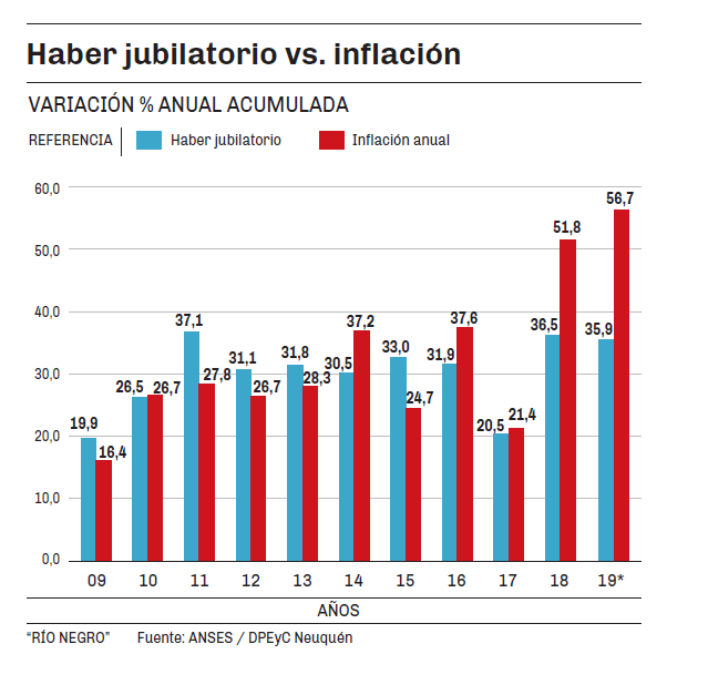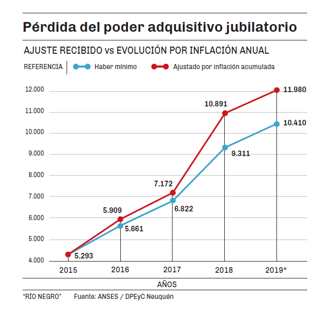 Con tales datos, es posible afirmar que a precios de diciembre de 2018 (es decir en términos reales), la pérdida acumulada durante todo el año 2018 asciende a $14.500. Significa que la poda que recibió el año pasado quien percibe el haber mínimo, equivale a un sueldo y medio.