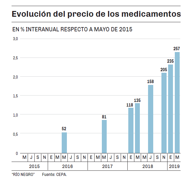 Un informe publicado esta semana por el Centro de Economía Política Argentina (Cepa) compara la evolución de los haberes jubilatorios mínimos con la del precio de los medicamentos, artículo de primera necesidad para los mayores. Del estudio surge que entre marzo de 2015 y marzo de este año, las jubilaciones crecieron un 172% mientras que el precio promedio de los remedios lo hizo un 257% (ver infograma). Si el periodo de análisis se acota solo a los últimos doce meses, tiempo que lleva vigente la nueva fórmula de movilidad en los haberes, resulta que las jubilaciones avanzaron un 35,9% mientras que el costo de los medicamentos lo hizo un 90%.