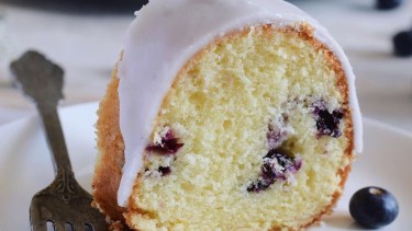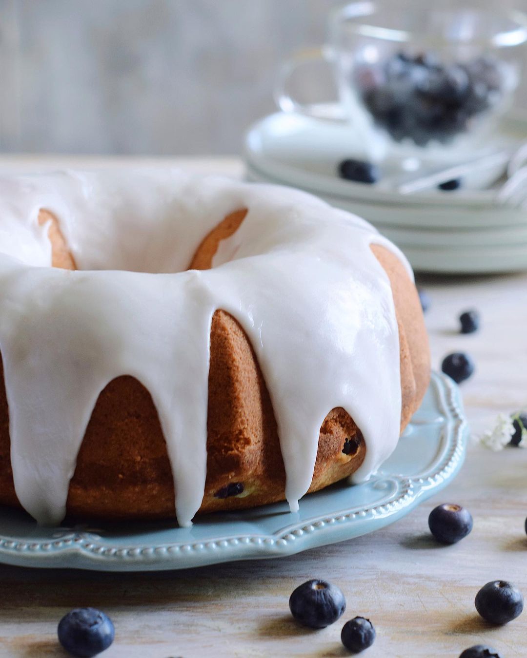 Enmantecamos y enharinamos un molde de 24/26 cm de diámetro y ponemos la mitad de la mezcla de budín, colocamos los arándanos y sobre los arándanos el resto de la mezcla. Horneamos 40 minutos aproximadamente a 180° C. Una vez listo enfriamos y espolvoreamos con azúcar impalpable o glase hecho con 250 g de azúcar impalpable y jugo de 1/2 limón.