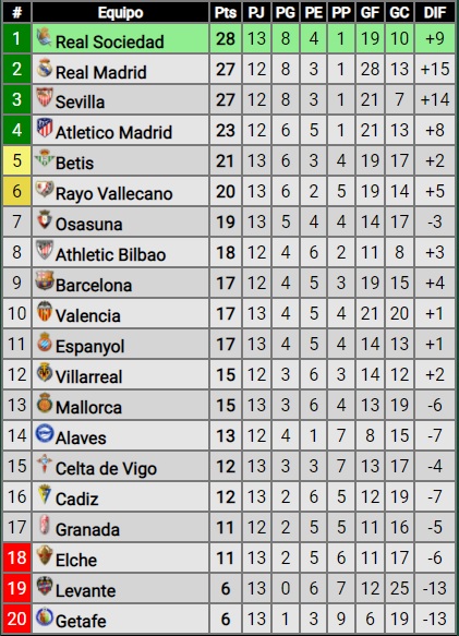 Sevilla llegó a 27 puntos e igualó la línea de Real Madrid y el líder es Real Sociedad, que hoy superó a Osasuna en Pamplona por 2 a 0, y suma 28 unidades. Cabe mencionar que el equipo del Huevo y el Merengue tienen un partido menos disputado.