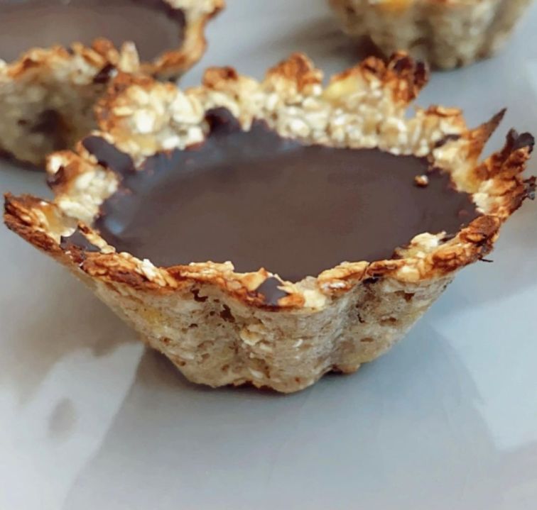 Aplastar la banana con un tenedor y mezclarlo, dentro de un bol, con los copos de avena. En un molde para magdalenas o muffins (silicona para poder desmoldar mejor) añadir la mezcla con una cuchara rellenando solo la base y las paredes. Que quede espacio en el medio.
