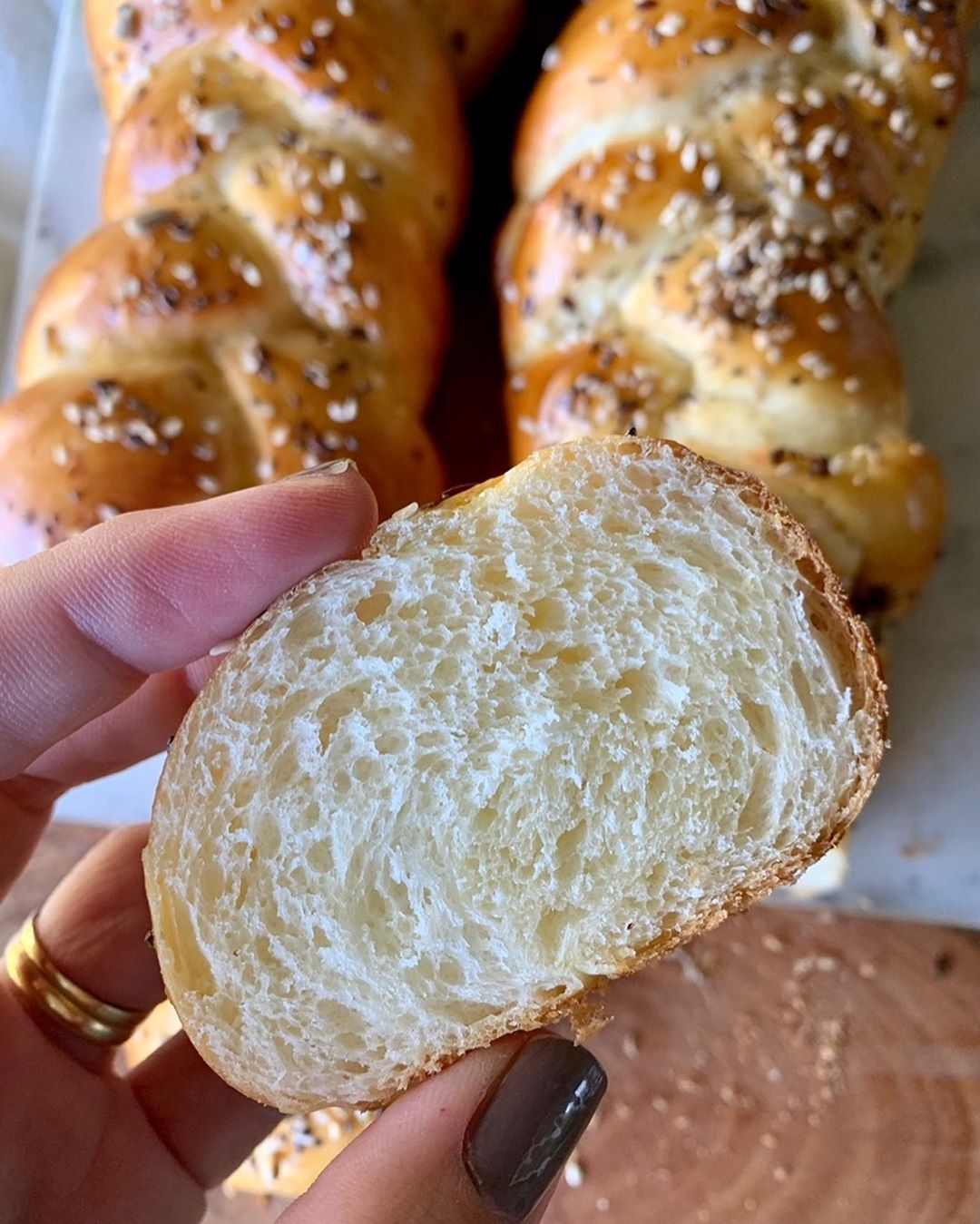 Colocar la masa en un bol, tapar con film y dejar levar 90 minutos hasta duplicar su volumen. Colocar la masa en una superficie enharinada formar un rollo y dividir en 12 porciones iguales. Formar rollitos de 30 cm aproximadamente con cada porción y formar cuatro trenzas.