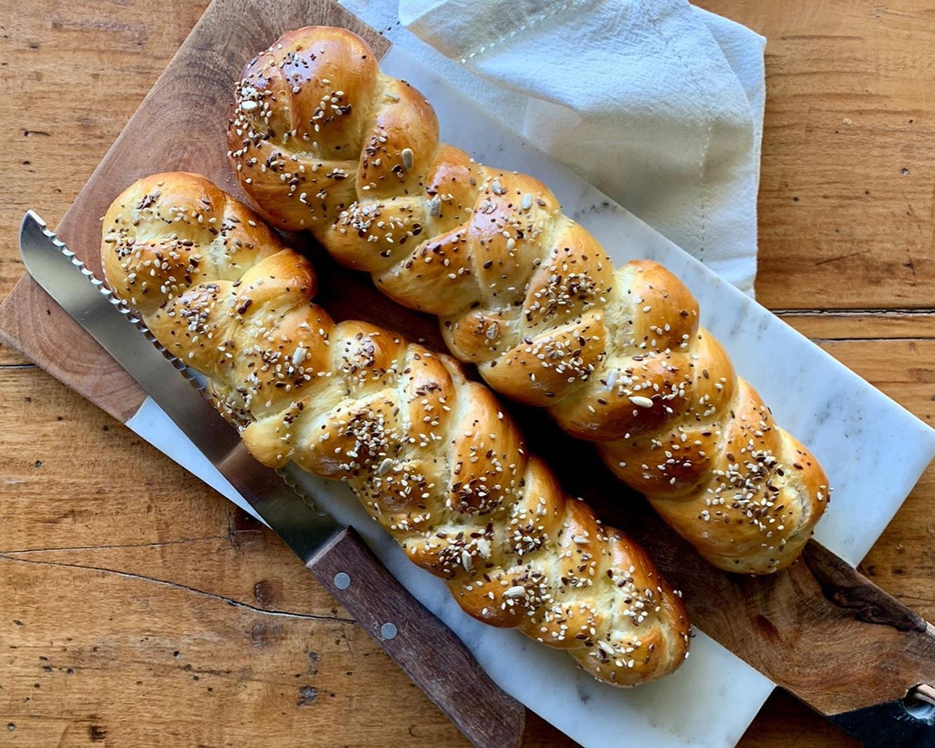 Colocar sobre una placa aceitada y tapar con film, dejar levar por 45 minutos o hasta que duplique su tamaño. Pincelar con la mezcla de yema y leche y espolvorear con las semillas.