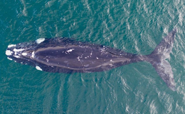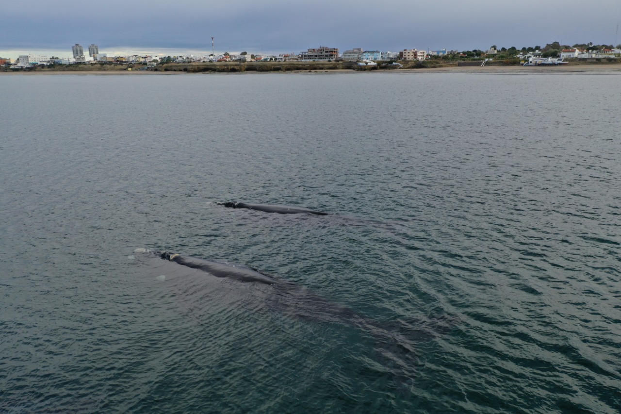 El domingo arrancó lluvioso y con poca visibilidad. «Hacia el puerto había una mancha gris muy larga. Y con el largavista observé que eran pardelas, aves chiquitas en una enorme bandada. Bajando el largavista, encuentro a las dos ballenas. Como lloviznaba las miré sin levantar el drone. Pero después decidí sacarlo y ahí vi que eran tres las ballenas. Hice una primera filmación y después la segunda, frente a casa. Tomé fotos de bien cerca y de arriba, en especial para Malala, porque ella hace fotoidentificación según las manchas que tiene arriba. De esa manera sabe si es nueva en el golfo o ya había estado antes».