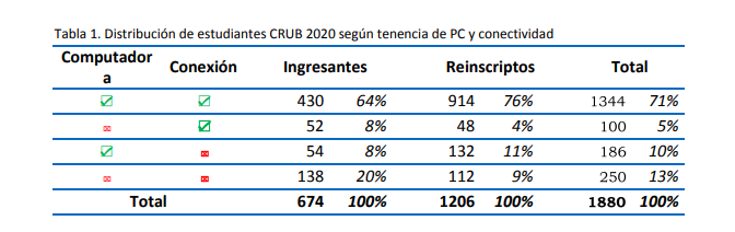 La problemática llamó la atención de las autoridades del CRUB y el Equipo de Gestión diseñó una encuesta focalizada en aquellos ingresantes y alumnos regulares que indicaron, al momento de inscribirse, tener algún problema de conectividad.