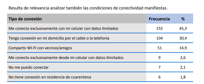 La mitad (49%) del alumnado entrevistado se conectan a internet a través de wifi, ya sea en su domicilio, por medio de alguna compañía de cable o telefonía, o compartiéndola con amigos/vecinos. La otra mitad (45%) utiliza el crédito de datos móviles (limitados) del celular para conectarse a internet. Según la encuesta, un 2,1% declaró que no se puede conectar de ningún modo y un 1,8% no tiene conexión en el lugar donde cumple la cuarentena.