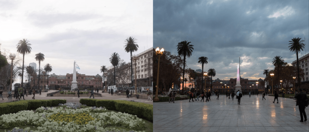 Precisó que la plaza que se ve en la foto “no existe desde hace un par de años”, ya que la modificaron “y ahora es todo un playón blanco”, como se puede ver en fotos y videos oficiales publicados por la Casa Rosada después de que se reinaugurara la remodelación de la Plaza de Mayo en 2018 (ver acá, acá, acá, acá y acá).