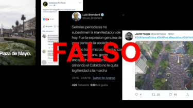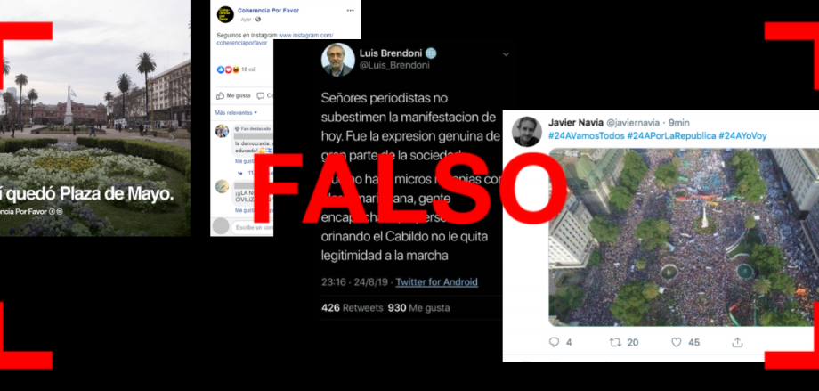 Una de las fotos que circuló fue tomada en diciembre de 2015, cuando Cristina Fernández de Kirchner dio su último discurso como presidenta. El tuit que supuestamente es del actor Luis Brandoni y que cuestiona a los periodistas que criticaron la marcha es de una cuenta paródica que en la publicación viral no aclara que lo es. La otra imagen de Plaza de Mayo que se difundió como actual fue publicada en 2017.