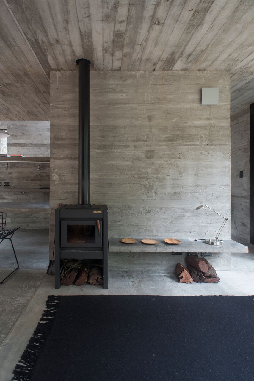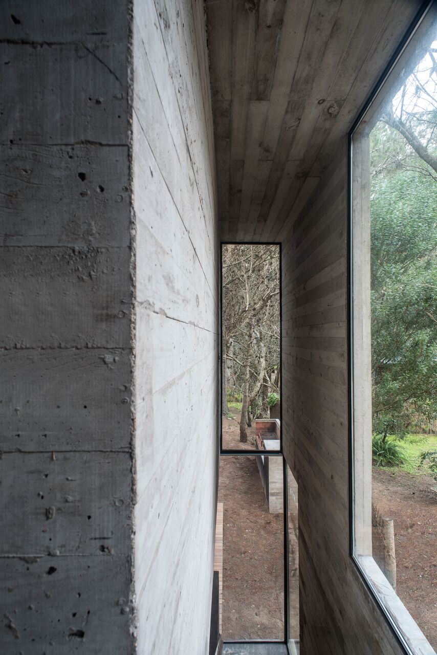 Para conformar los encofrados recurrimos al uso de tablas de madera de pino. Esta decisión se fundamentó en la pretensión de que tanto la terminación material de los paramentos como la de las losas conservaran la textura de la beta de la madera, en la búsqueda de un diálogo armonioso con la corteza de los pinos propios del lugar.