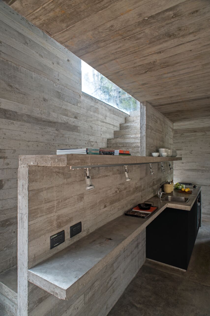 La elección de la materialidad fue un acuerdo conjunto. La totalidad de la casa fue construida en hormigón visto, lo cual contribuyó a la economía de su mantenimiento. A fin de reducir al mínimo la incorporación de equipamiento, incluso el mobiliario fue concebido como parte de la caja de hormigón.