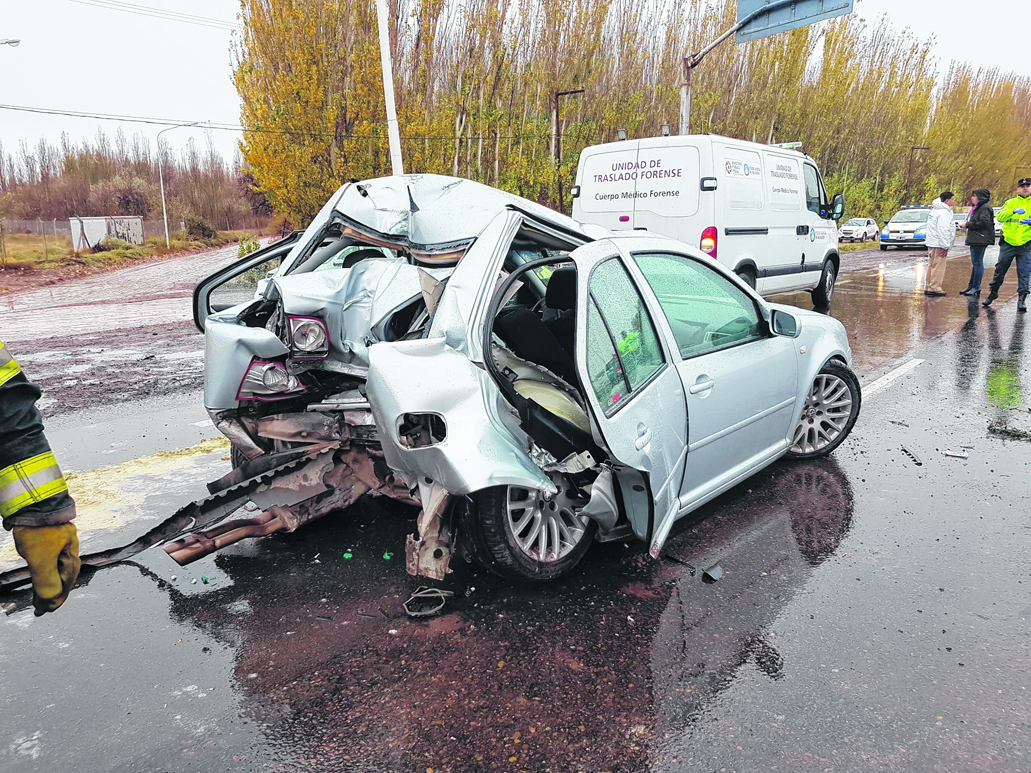 Según las primeras pericias el auto circulaba a alta velocidad, la cinta asfáltica tenía agua acumulada y caía llovizna en ese momento.