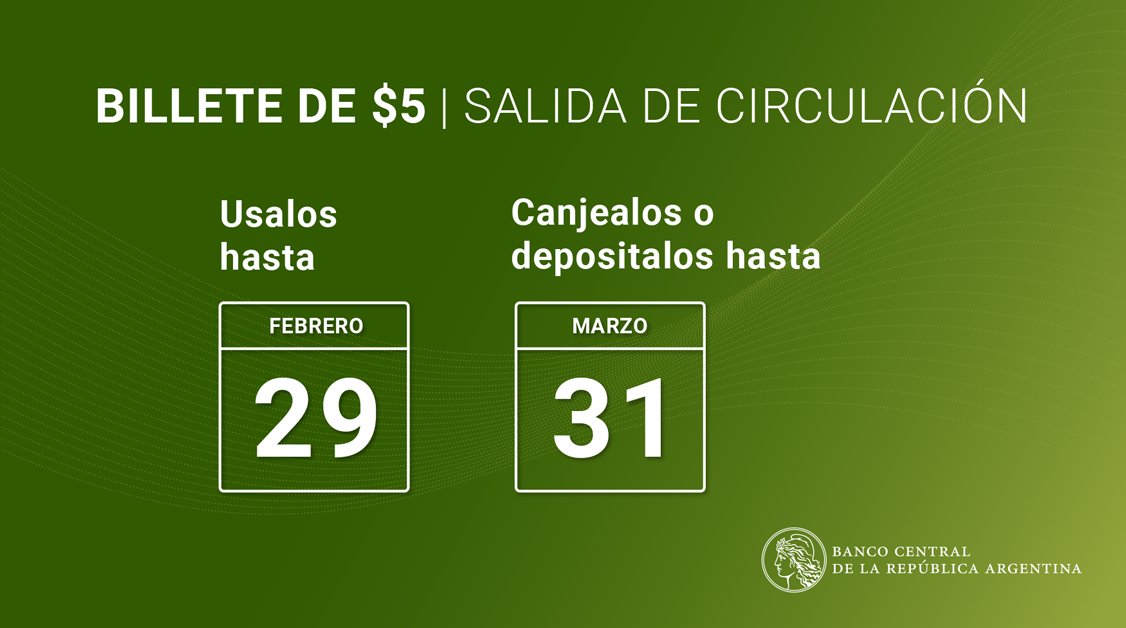 El BCRA había decidido, a fines de enero, extender el calendario de salida de circulación de los billetes de 5 pesos, por lo que hasta el 29 de febrero se podrán seguir usando en todos los negocios y comercios del país para cualquier transacción. Luego de esa fecha y hasta el 31 de marzo sólo se podrán depositar los billetes en cuentas o canjearlos en las sucursales bancarias del país.