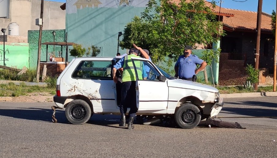 A raíz del fuerte impacto, la motocicleta quedó debajo del Fiat Uno que terminó su marcha sobre la vereda y un cantero de la esquina sudoeste de la calle Chubut.