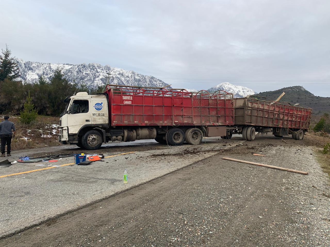 Un camión chileno que transportaba 70 terneros volcó ayer por la tarde en la ruta 40, a la altura de la recta de Lewis, al pinchar un neumático trasero. El chofer sufrió una fractura y dos animales murieron.