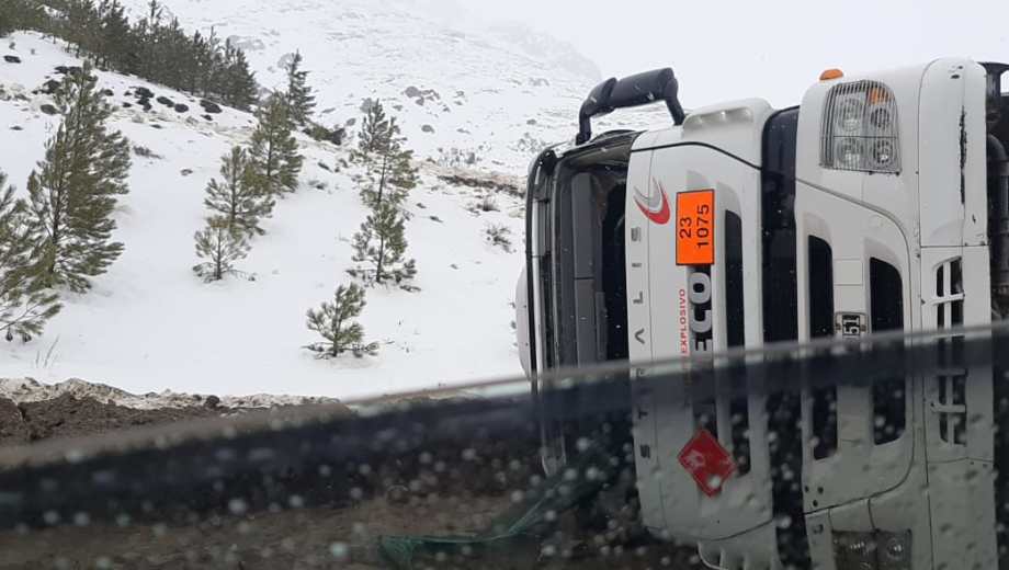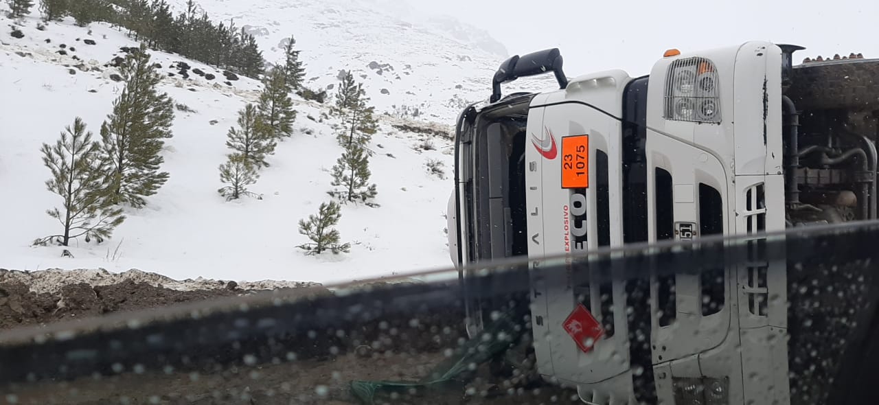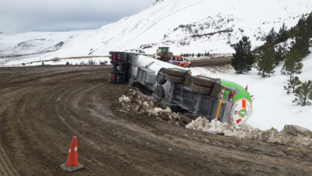 El barro le jugó una mala pasada al acoplado de un camión de la empresa Tortoriello y provocó el vuelco del vehículo pesado sobre la Ruta Provincial 46, en el ramo de la bajada del Rahue.