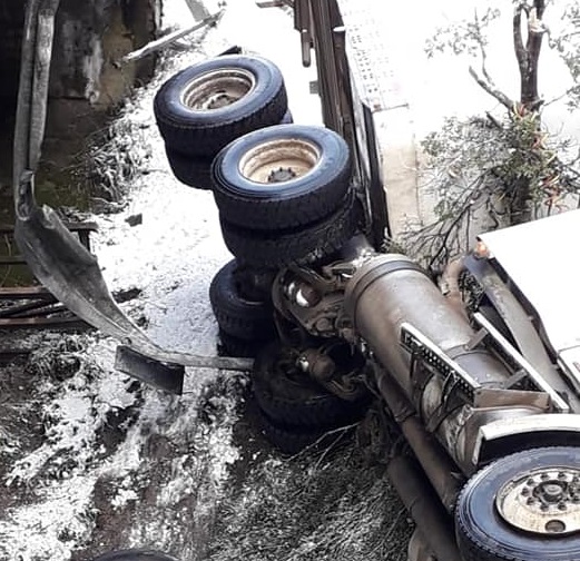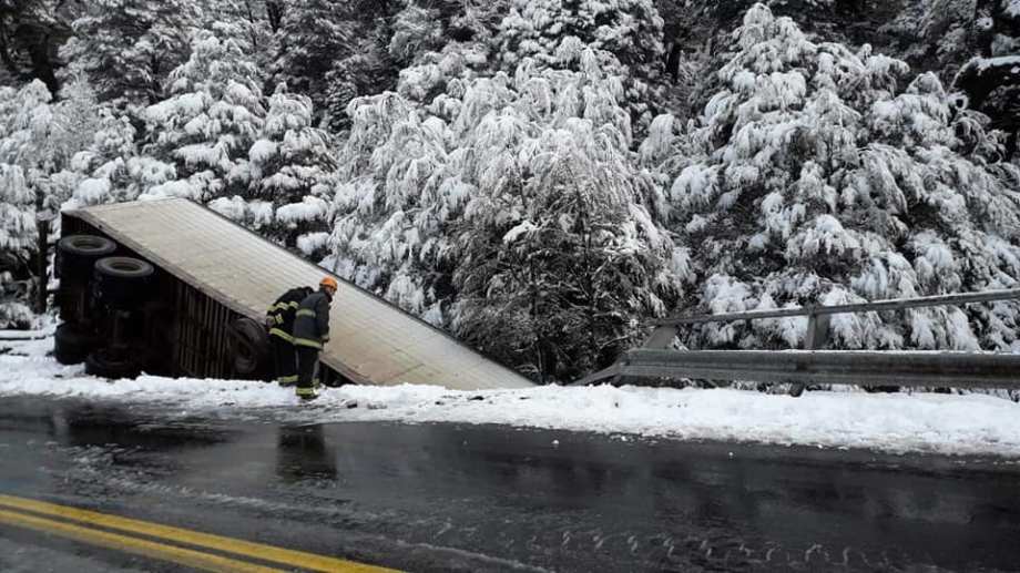 Un camión chileno volcó y cayó de un puente en el paso Cardenal Samoré mientras salía de Argentina. El conductor sufrió lesiones leves y fue trasladado al hospital de Villa La Angostura.