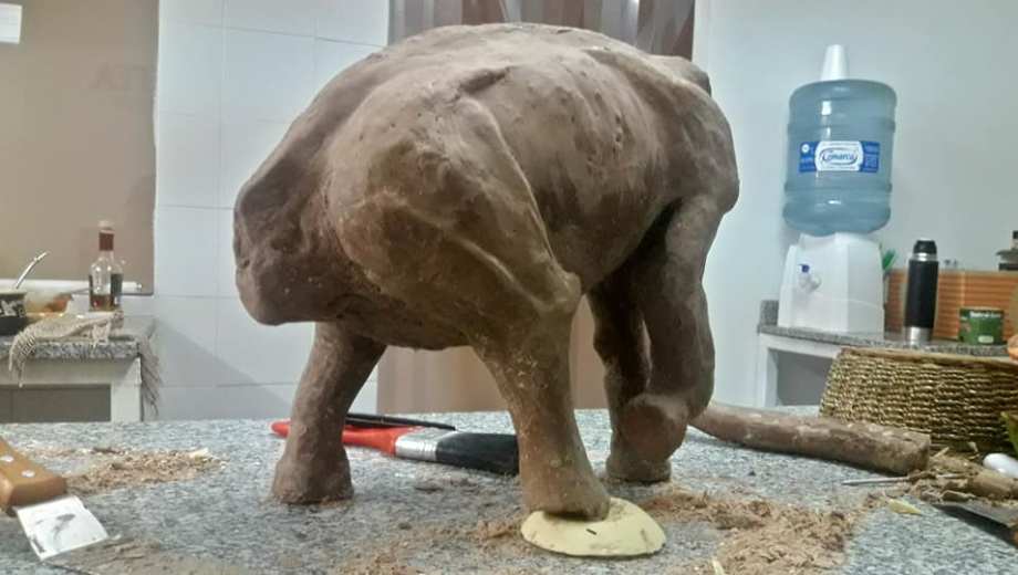 A partir de allí empezó a esculpir toda la escultura. Luego continuó con la mano y después fue formando la cabeza, la cola, y la cara. “Todo a mano”, subrayó.