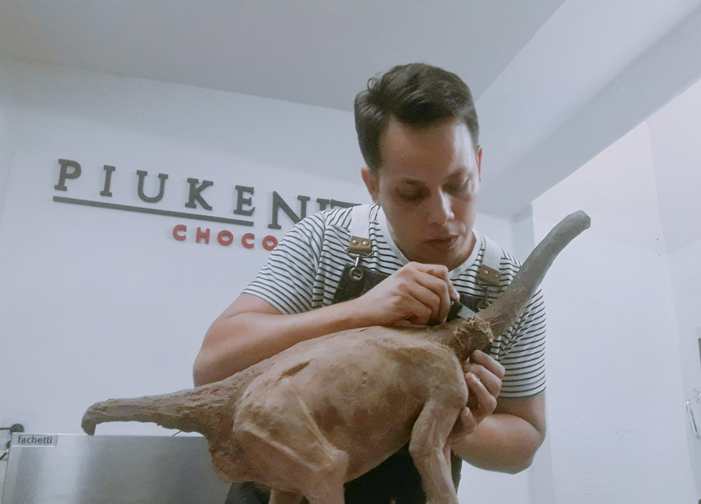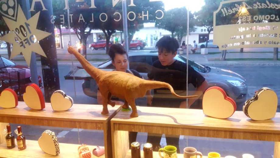 “Hice un dinosaurio de chocolate, que es el Argentinosaurus Huinculensis”, afirmó el comerciante, dueño del comercio Piuke Nita. Presas tiene 38 años, es oriundo de Cutral Co y hace nueve años atrás decidió abrir una fábrica de chocolate artesanal.