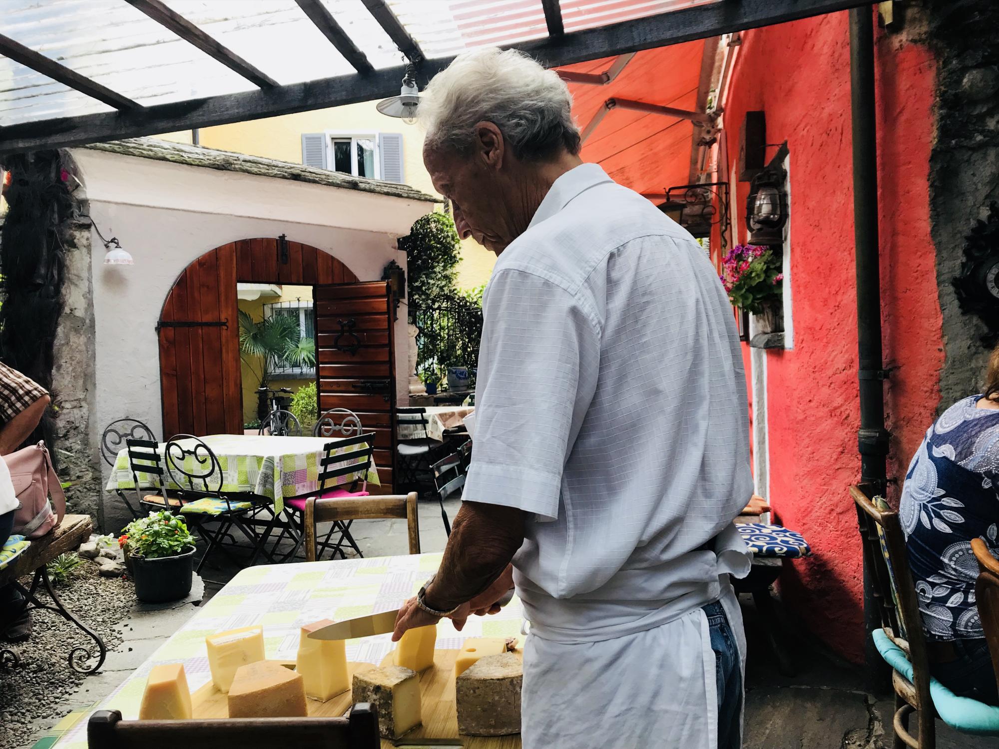 Lo particular del Grotto Baldoria es la forma de servir, todo es una fuente grande que pasa de mesa en mesa con ritmo de comedor popular. Las tablas de queso una vez que te cortaste y picoteaste te la sacan para acercarlas a los que van llegando después. Todo sucede entre construcciones de más de 500 años, patios y callecitas alegremente hermosas y un sol seteado para que la burbuja se mantenga muy arriba.