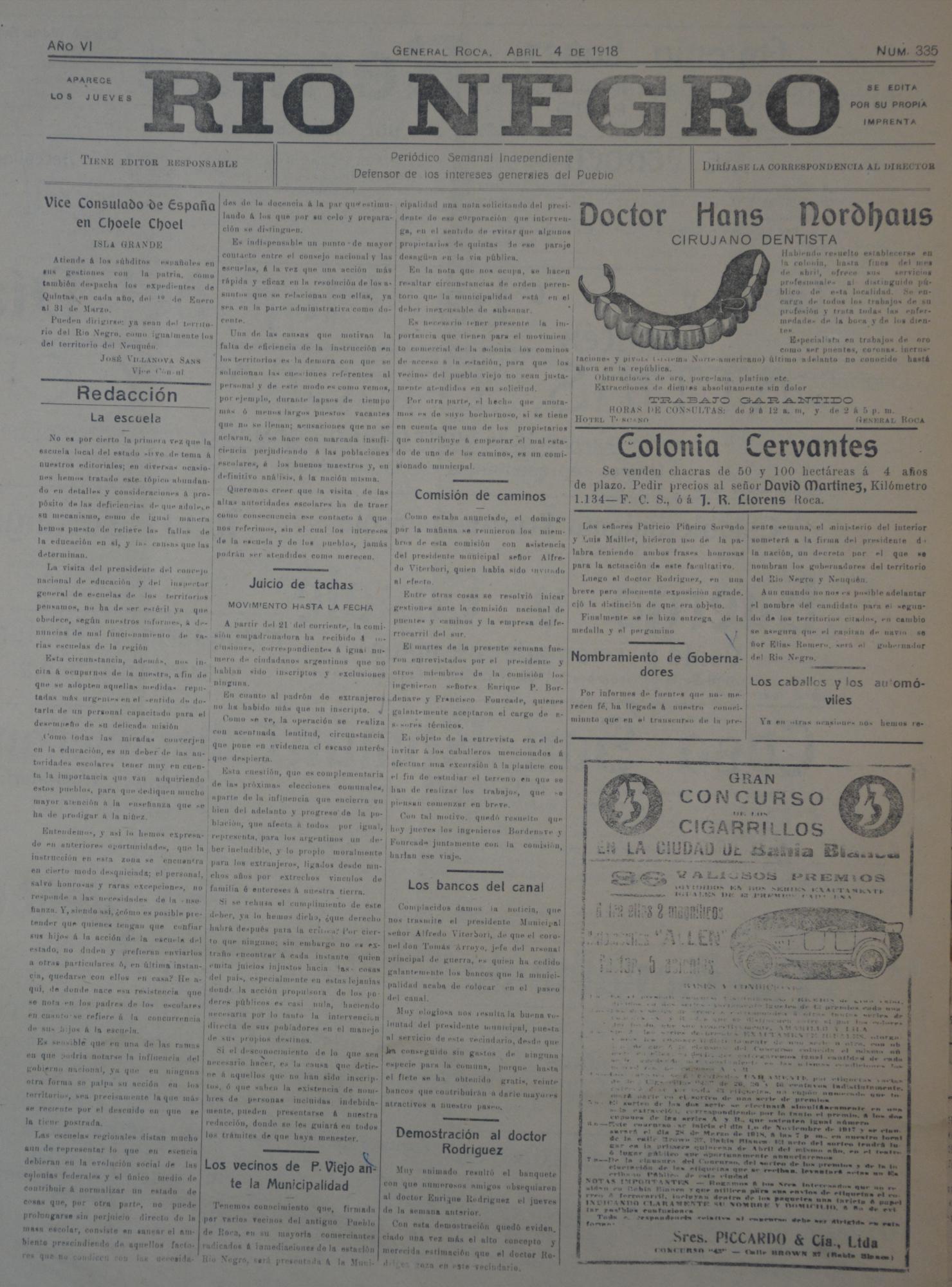 El vice cónsul José Villanova Sans anunciaba que atendería en la isla Grande de Choele Choel a los “súbditos españoles”.