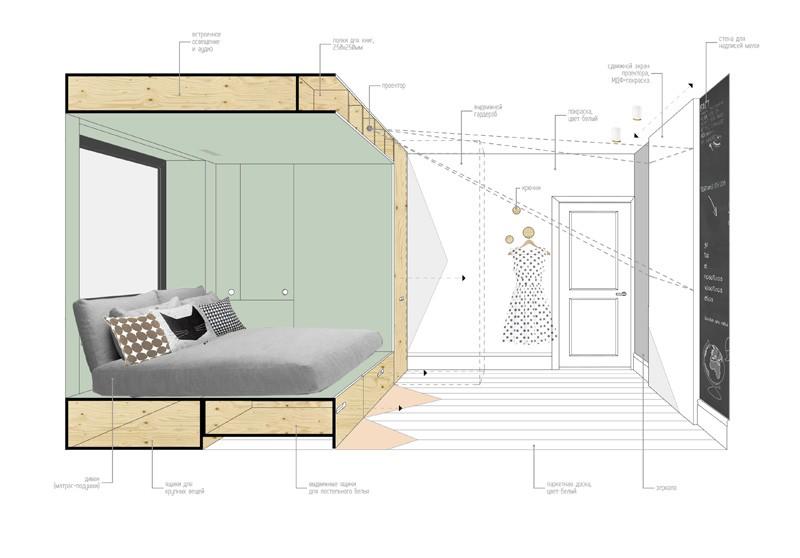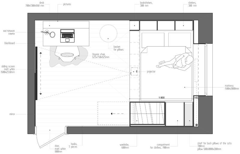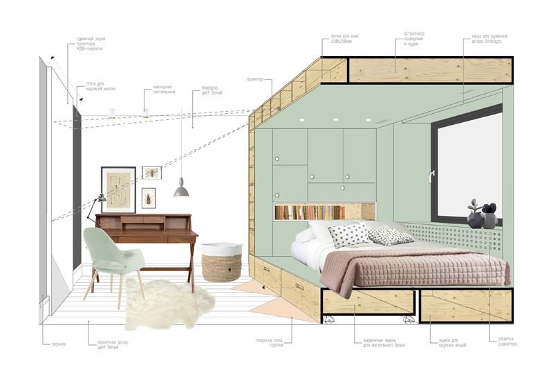 INT2architecture creó un dormitorio contemporáneo para una niña de 14 años, que cuenta con un sistema incorporado en la cama con un montón de almacenamiento. Incluso tiene un proyector de pantalla.
