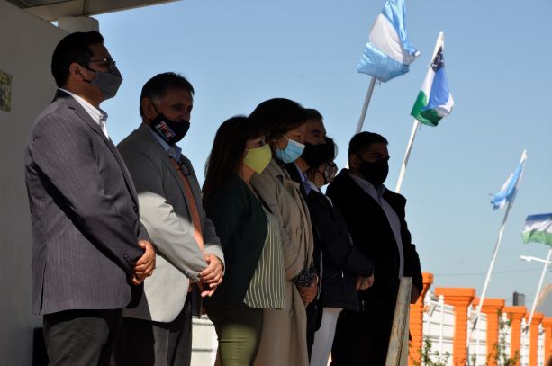 Con el protocolo correspondiente, unas 150 personas, entre los que se encontraban representantes escolares, funcionarios locales y provinciales, medios de prensa y vecinos, participaron de un acotado acto realizado en el plaza Aimé Painé, ubicada frente al edilicio municipal.