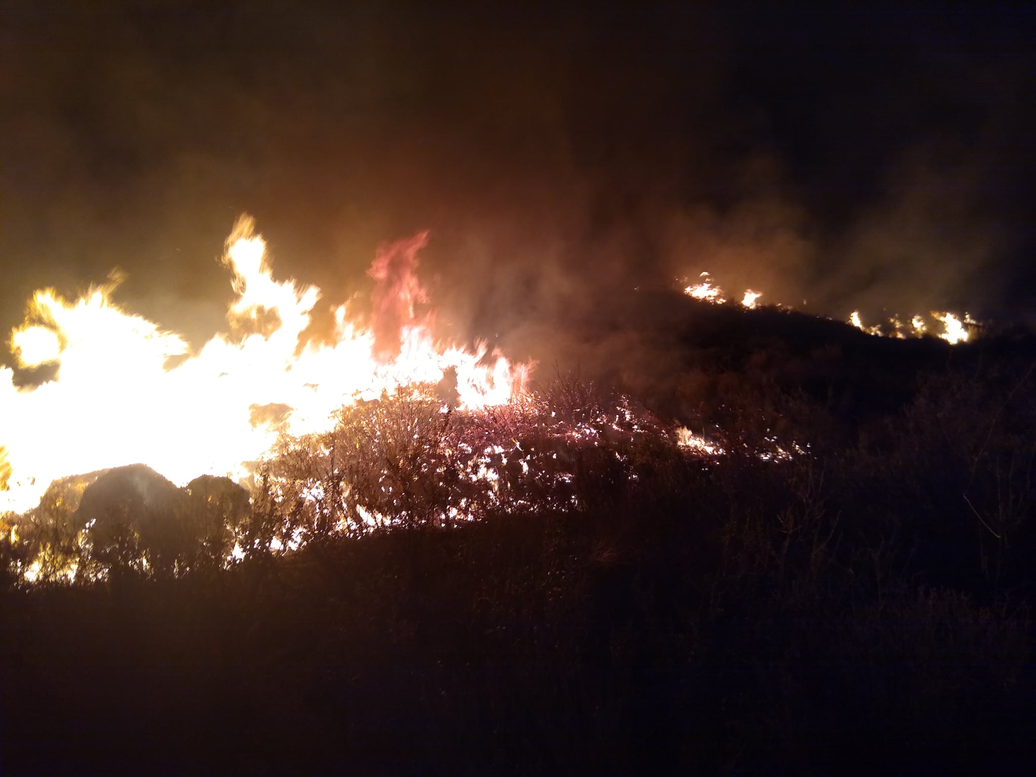 Durante la noche del sábado, las llamas pudieron verse desde varios kilómetros de distancia. Foto: Bomberos Voluntarios de Sierra Colorada.