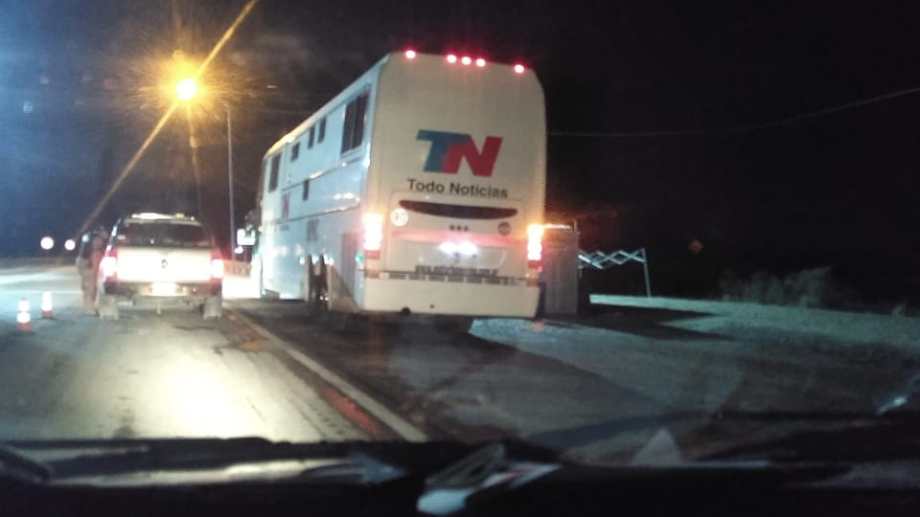 Un móvil de TN espera ingresar a Las Grutas para tomar imágenes
