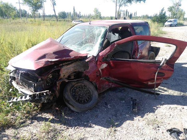 Tras el impacto, la camioneta se desvió hacia la banquina de la mano contraria a la que circulaba, golpeó contra una alameda y terminó dentro de una acequia de riego, mientras que el Renault Clio quedó detenido sobre la cinta asfáltica.