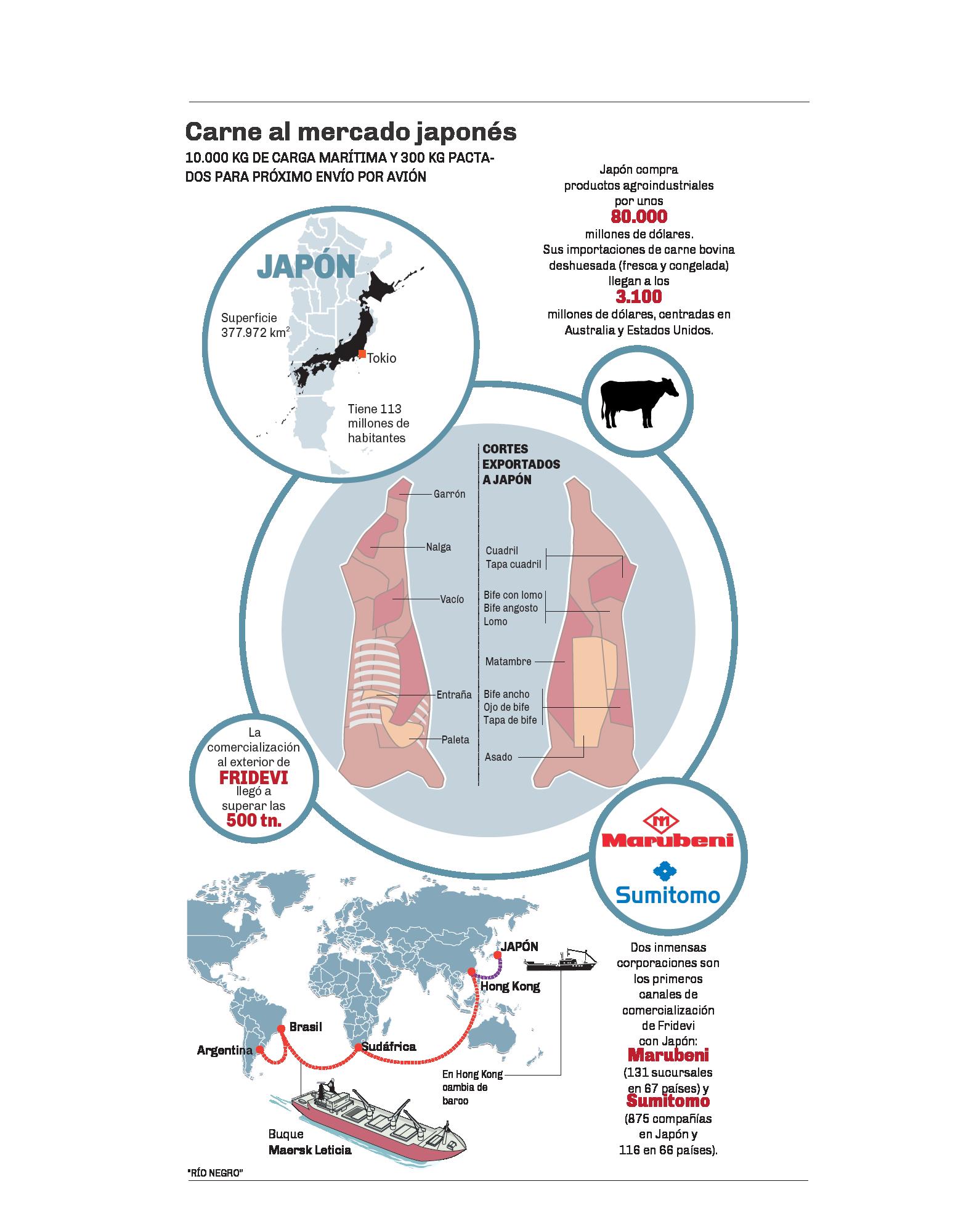El embarque inaugural -vía aérea- se cumplió el 28 de julio, con un promocionado acto por parte de los gobiernos de Nación y de Río Negro. Esta partida tuvo un objetivo claro: un encuentro efectuado el miércoles 1° de agosto en la embajada argentina de Tokio donde Marubeni presentó y ofreció la degustación de la carne argentina, llegada de tierras rionegrinas.