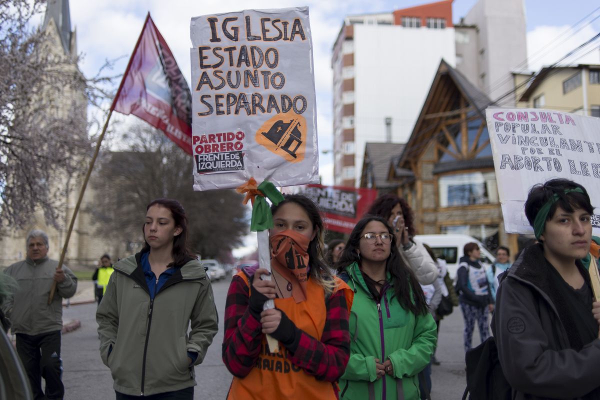 Cuando la columna pasó frente al gimnasio de Bomberos Voluntarios, las manifestantes levantaron la voz con cánticos contra la Iglesia porque en el interior del establecimiento deportivo se desarrollaba un encuentro religioso.