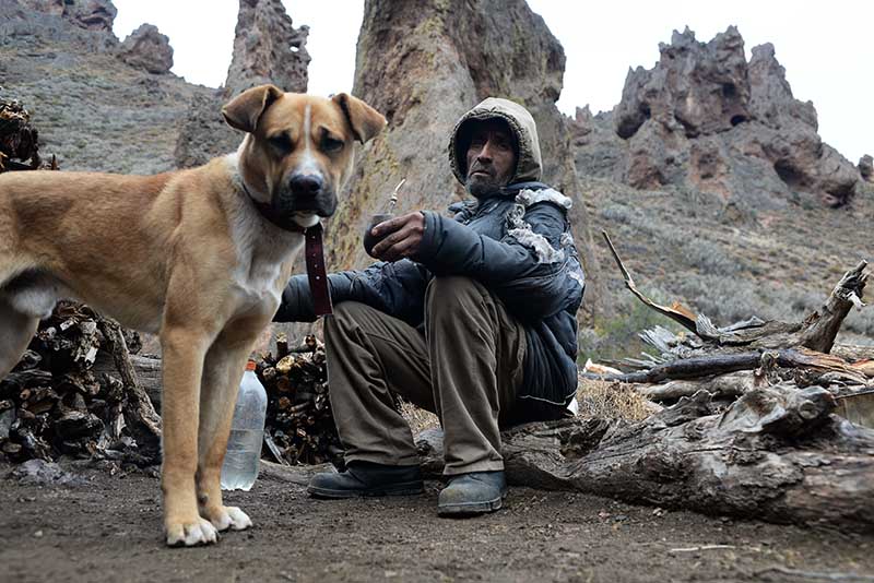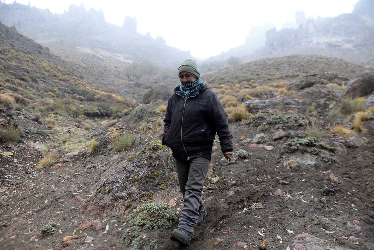 El sitio donde habita está casi rodeado de formaciones rocosas. “Conozco todas las piedras. Tienen vida”, sostiene. “Soy loco de las piedras. Tengo que tener una piedra al lado, si no estoy loco”, comenta, sonriendo. Julio recibe las donaciones amablemente y las guarda. El invierno aún no empieza y será crudo como siempre.