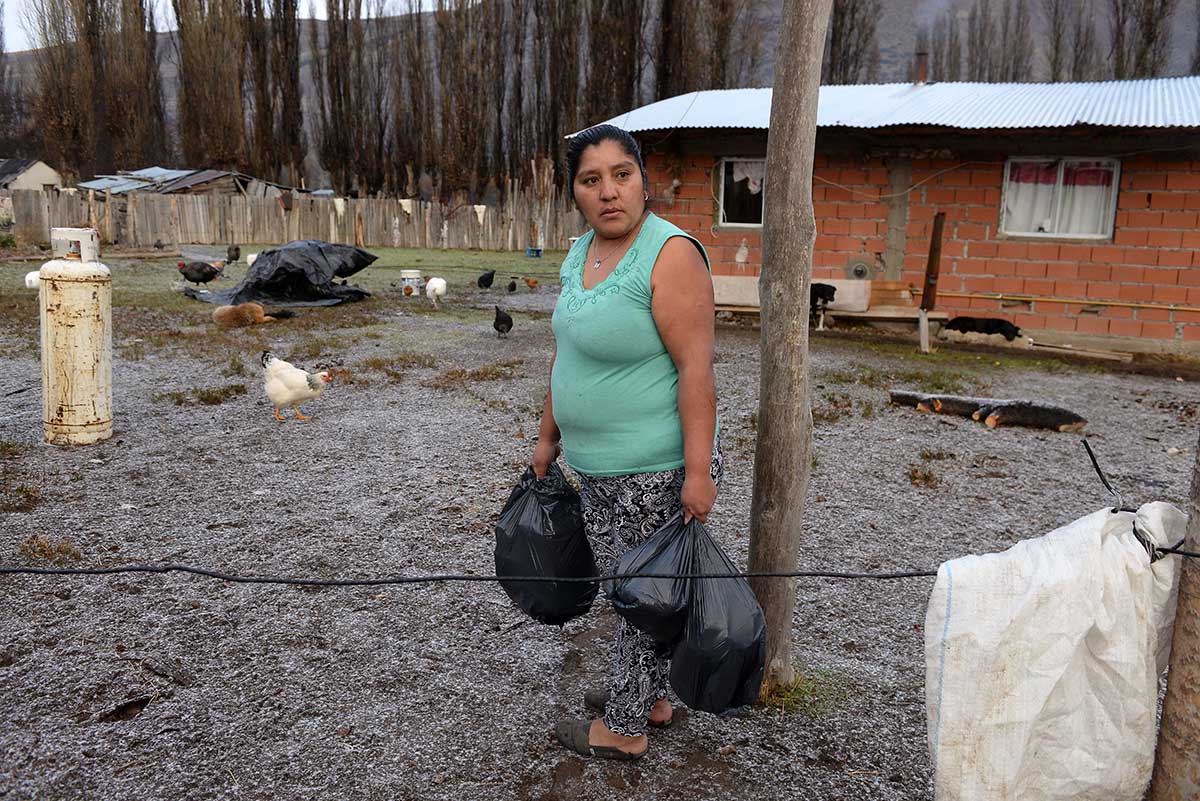 La casa de Susana Painequeo es una de las primeras paradas. La mujer sale al encuentro de Vanesa y Diego. Viste una musculosa en una mañana donde la temperatura roza los cero grados. Está sin trabajo desde que la hostería de Villa Llanquín cerró porque se cortó la temporada de pesca por la pandemia del coronavirus.