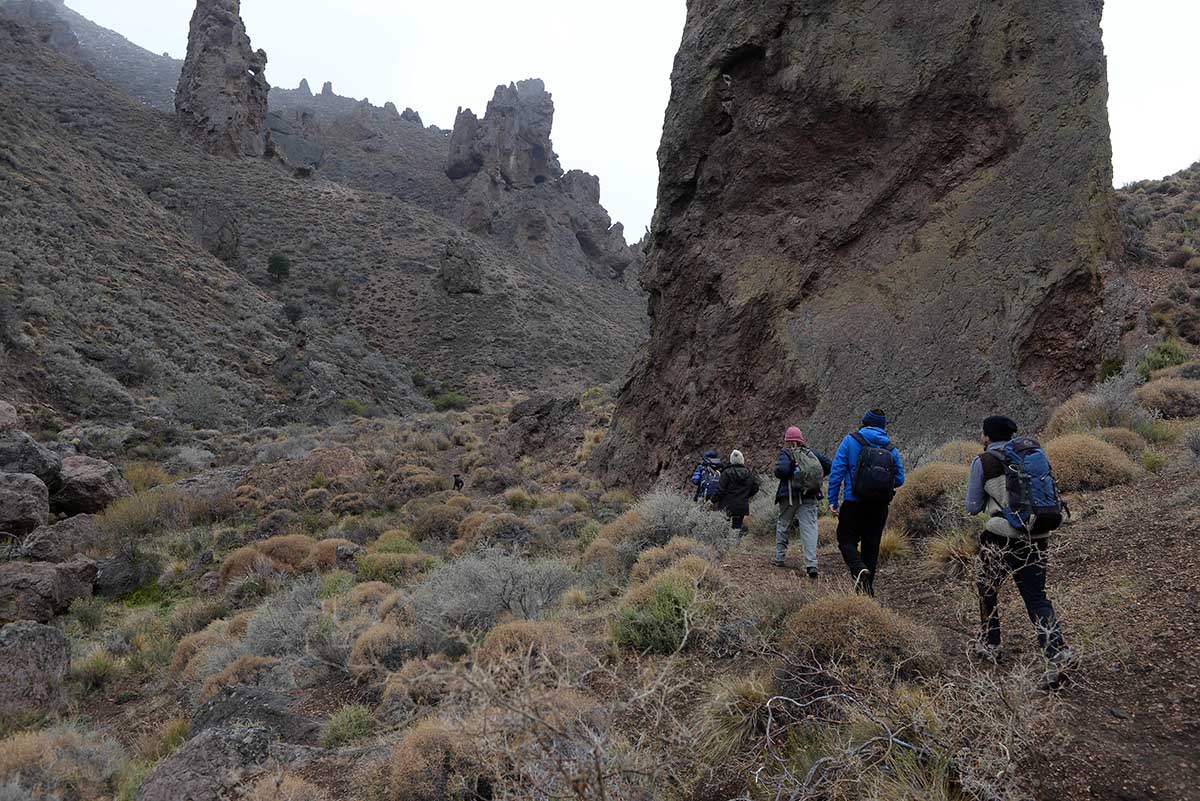 El grupo se interna en la estepa patagónica con la imponente piedra Guacha como testigo silencioso.