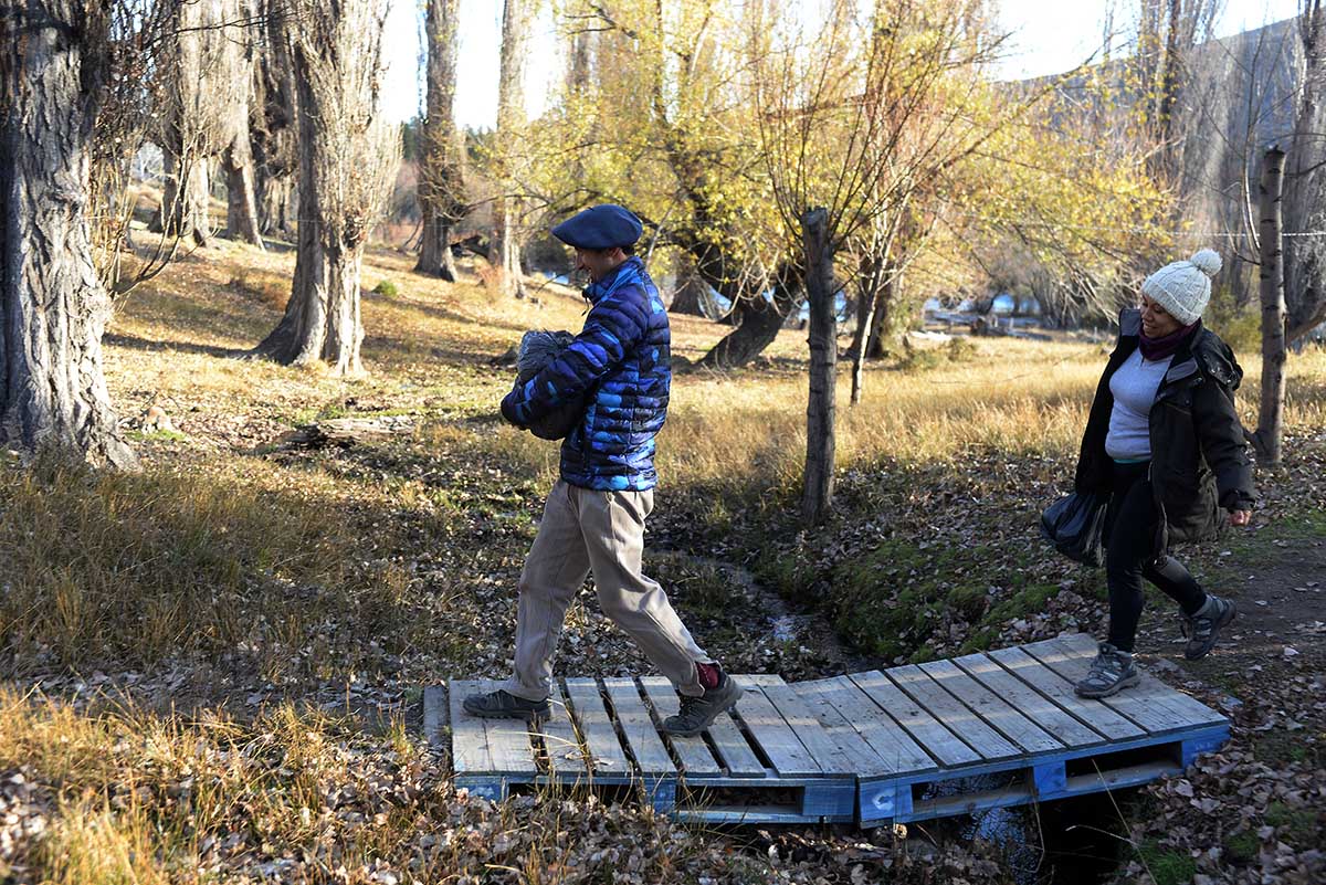 Viaja a Bariloche para comprar sus alimentos para el mes. Su hijo que vive en la ciudad la acompaña. “Cruzo por acá –indica– por el medio de los cerros hasta donde doña Orfelina y, después, salgo a Villa Llanquín”, describe. Regresa con su mochila cargada de cosas por el mismo sendero.
