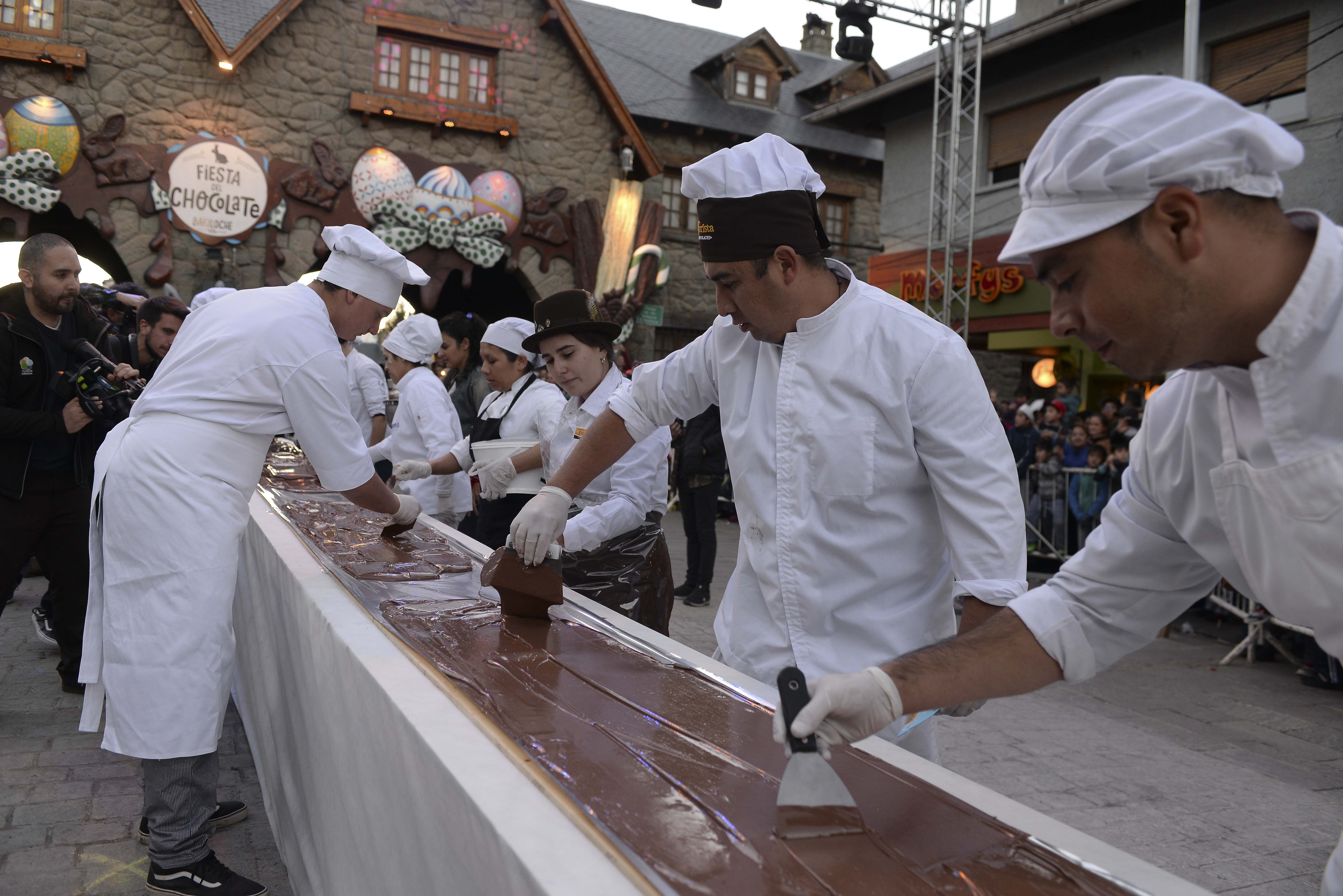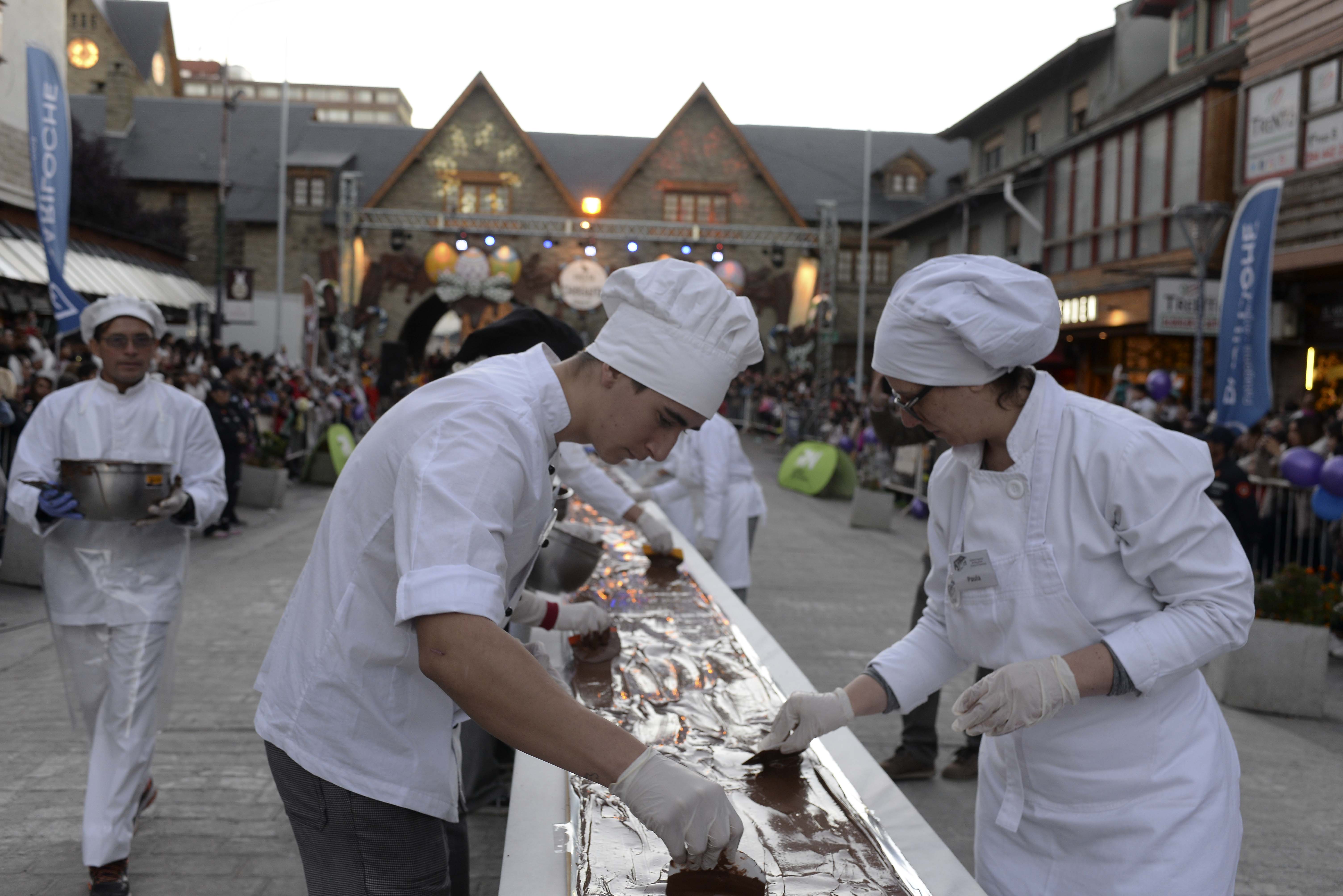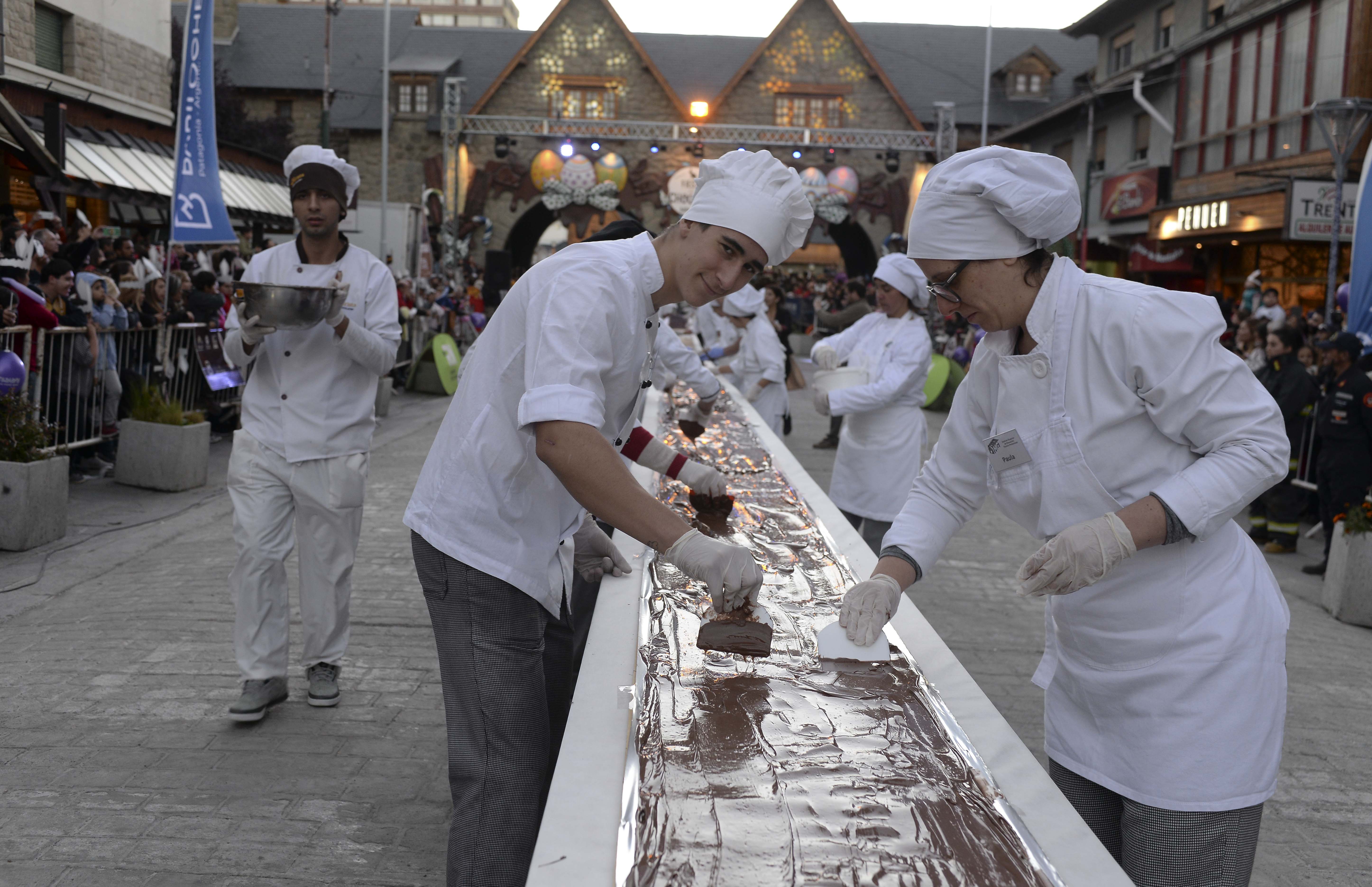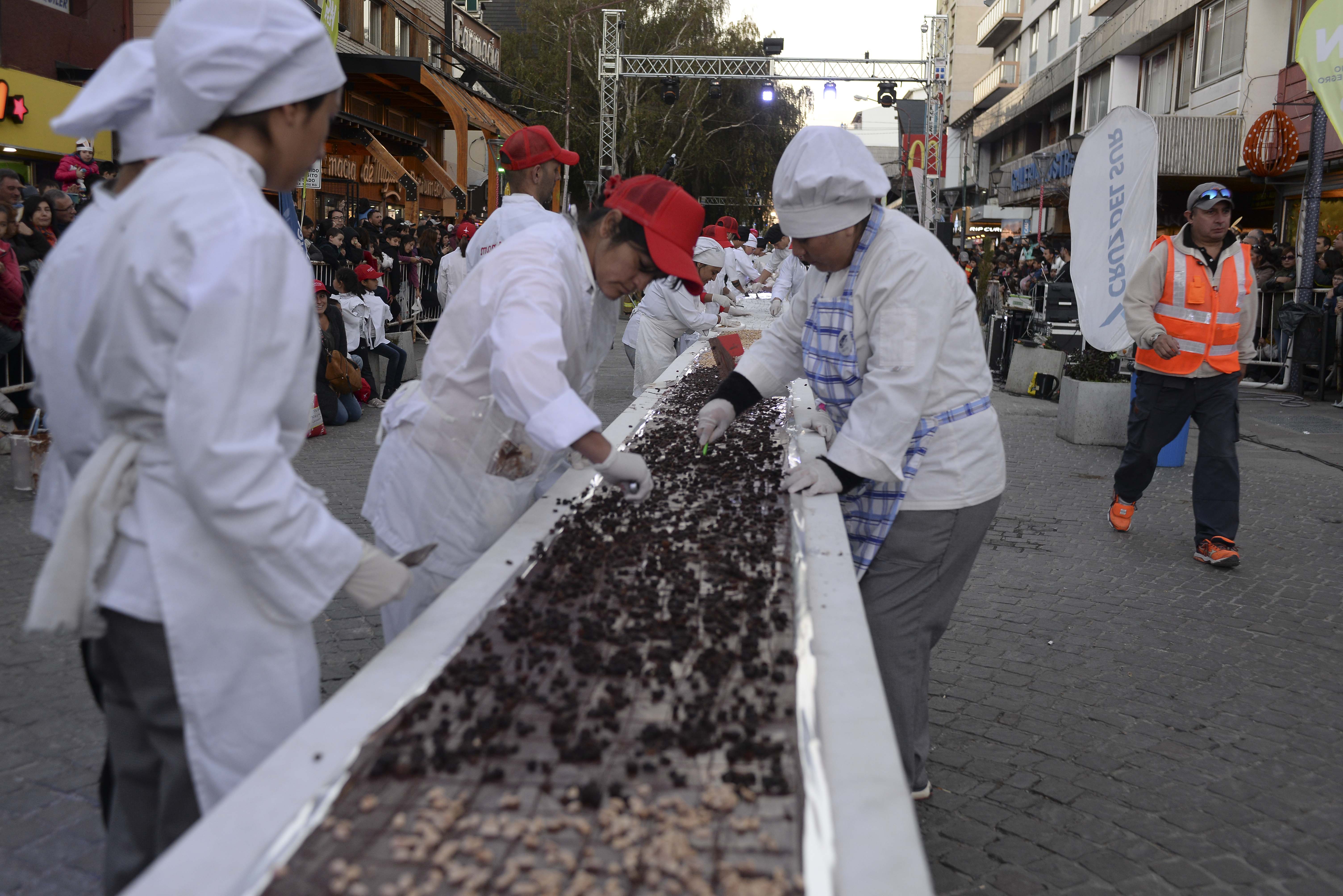 Los maestros chocolateros de Bariloche elaboraron  la barra de chocolate más larga del mundo.