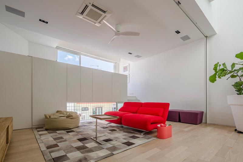 Las principales áreas de servicio de la casa están en el del sótano, dejando la planta baja como un gran espacio abierto con un patio central.