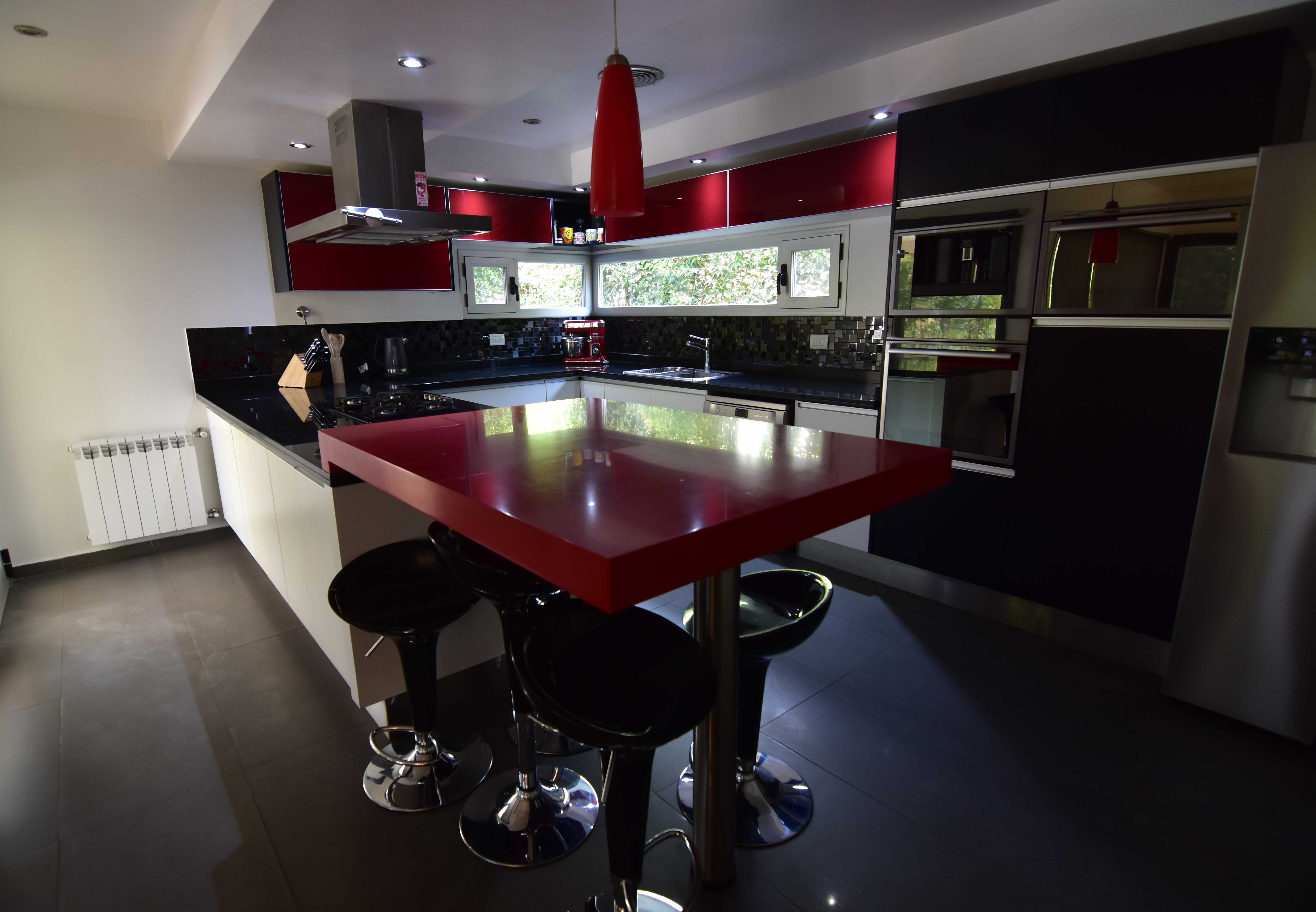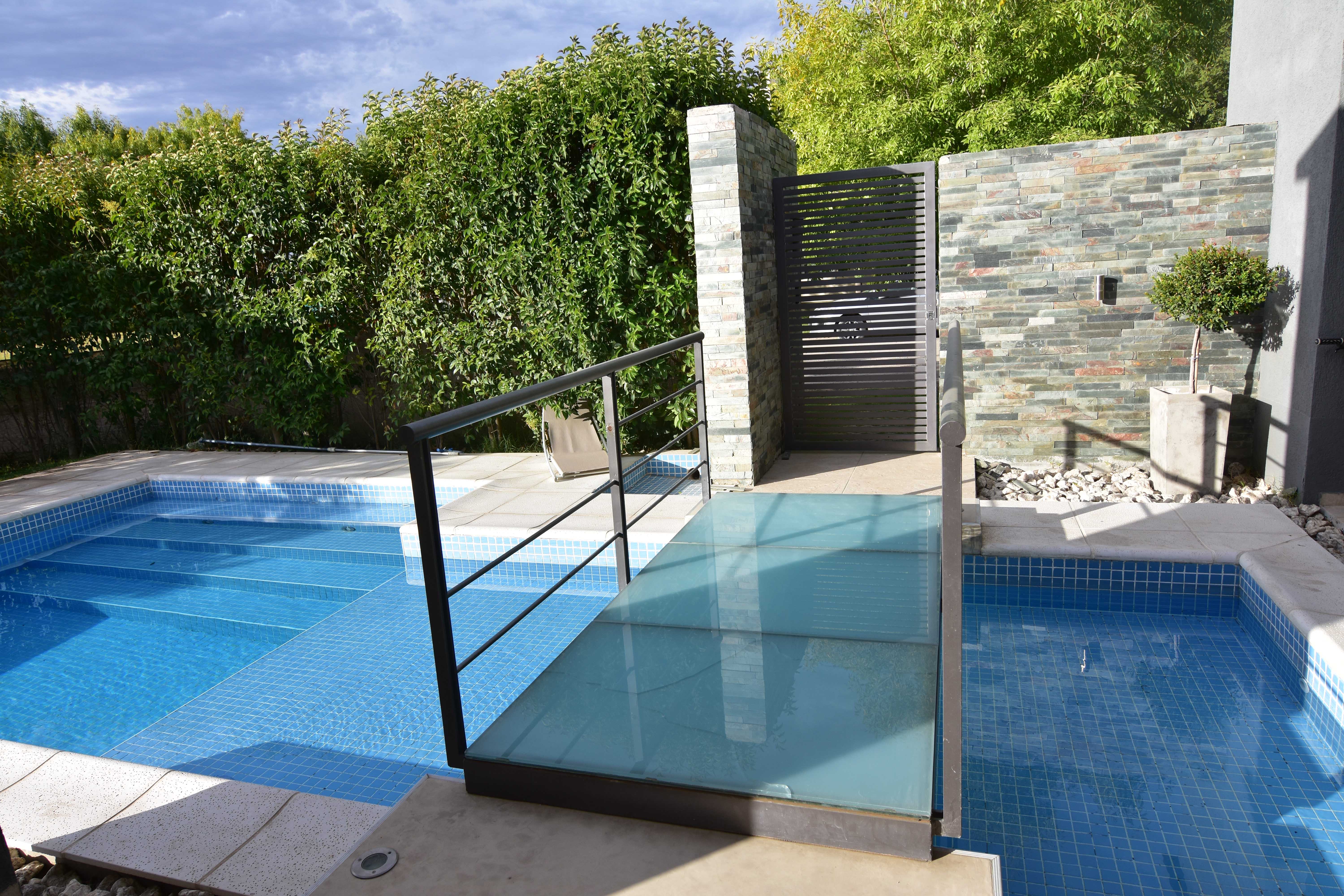 El acceso principal a la casa es través de un puente de vidrio laminado con barandas de acero inoxidable que atraviesan un sector de la piscina que caprichosamente rodea la galería y es apreciada desde todos los sectores de la zona de estar.