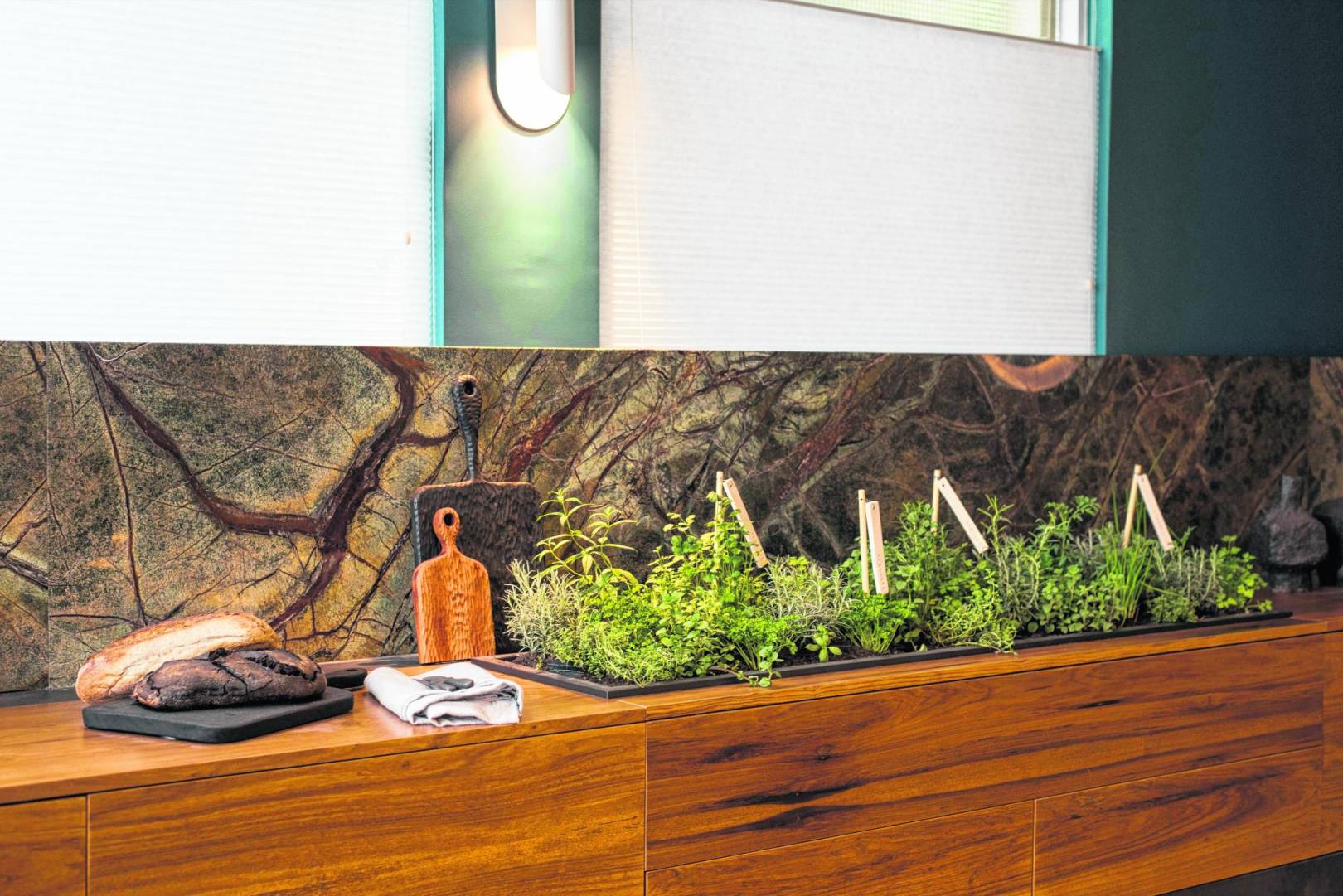 La segunda mesada, elaborada en madera, flota instalada sobre una pared revestida en mármol verde bosque. En uno de sus extremos se alojará el sector de lavado y en la zona opuesta una huerta de aromáticas para el uso diario de cada plato.