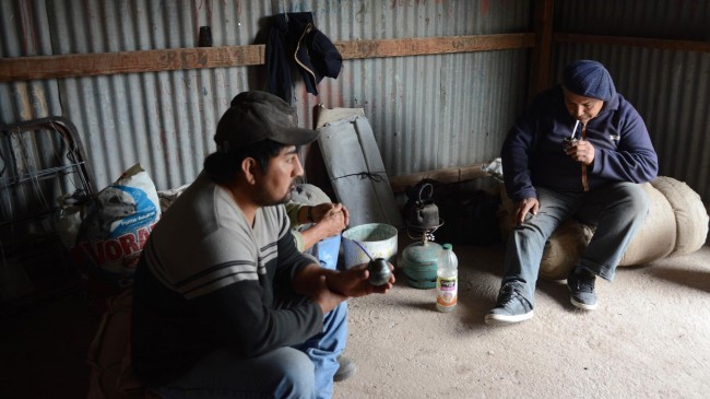 En Rucu Luan, los “veteranos” eligieron para dormir un pequeño galpón sin puerta, con vista al mallín. Segundino López, que ha esquilado en Santa Cruz en otras campañas, cuenta que “a veces no nos dan lugar y dormimos afuera. Ahí te armas una carpita con lona y cuando despertás ves que está blanca por la helada”.