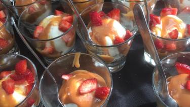 Mezclar los merenguitos con los bizcochos cortados en cubos y cubrirlos con la mermelada aligerada. Reservar. En una copa o vaso disponer en capaz la mezcla de bizcochos, frutillas y banana, un poco de crema de dulce de leche. Repetir el proceso respetando el orden de los ingredientes hasta que se hayan acabado.