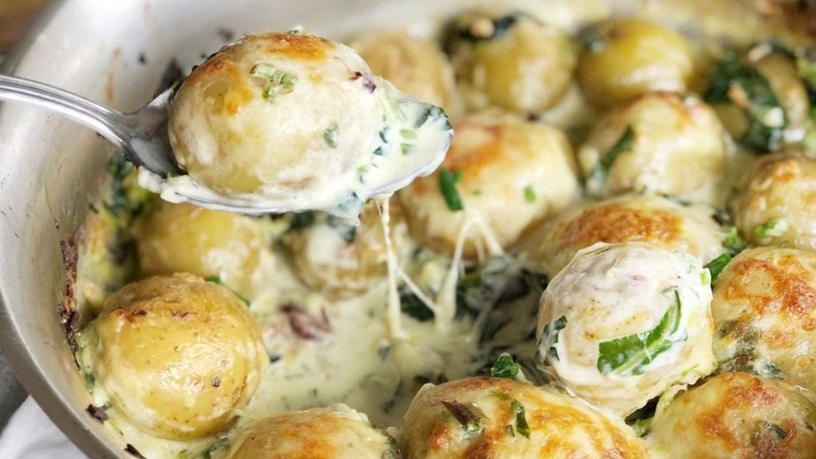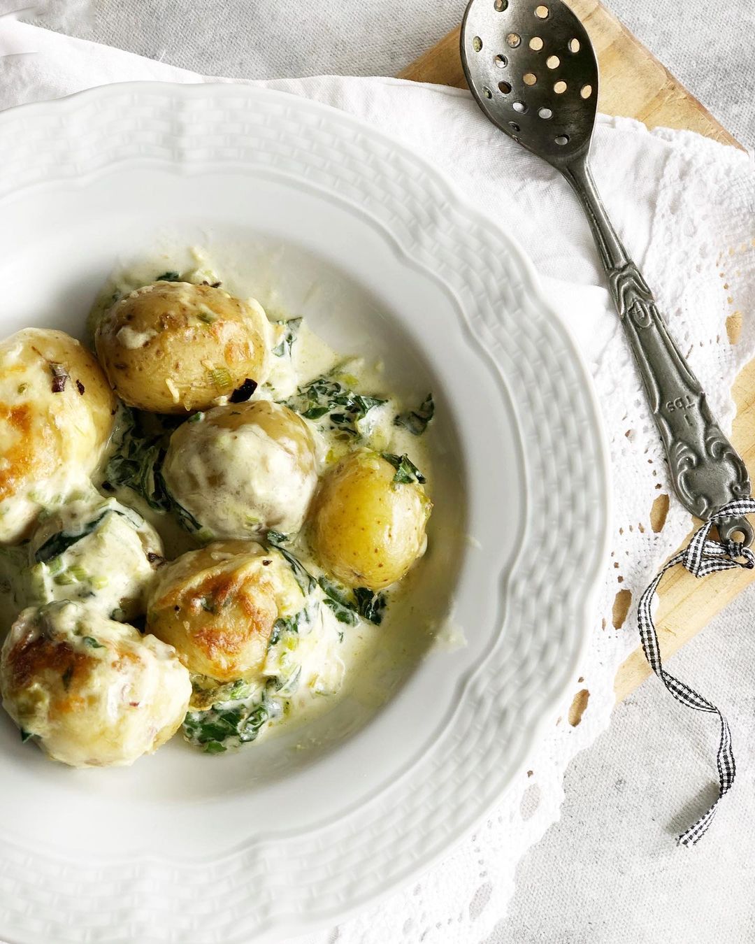 Herví los papines (previamente lavados) hasta que estén tiernos. Salteá el puerro cortado chiquito, incorporá las papas y salpimentá. Agregar el ajo picado. Cortá las hojas de acelga y/o espinaca y agregalas a las papas. Añadí la crema de leche y cociná unos minutos más. Colocá mozzarella rallada encima y llevá la preparación al horno, a fuego fuerte, para gratinar. Terminá con un poco de cebolla de verdeo.