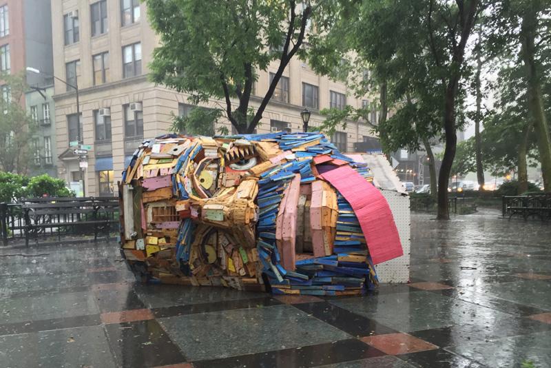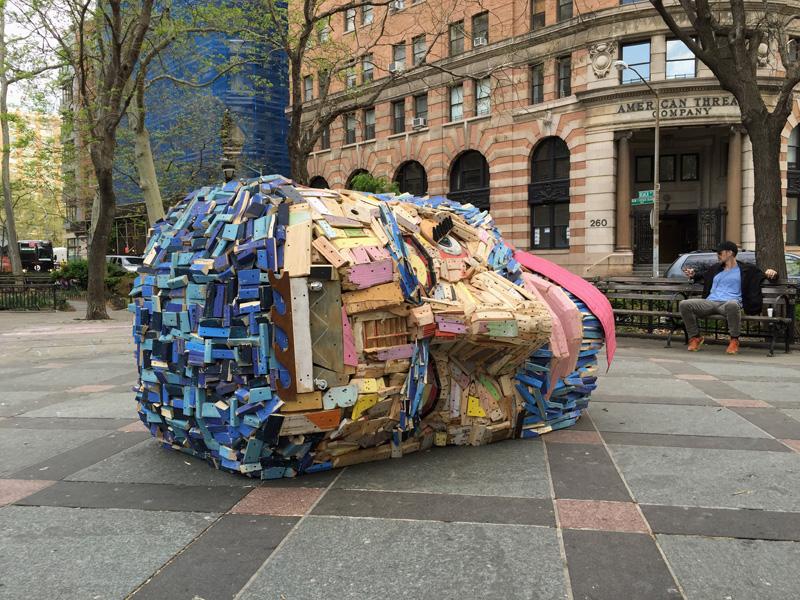 Una gran cabeza hecha de madera recuperada y objetos encontrados se encuentra en un parque en Nueva York