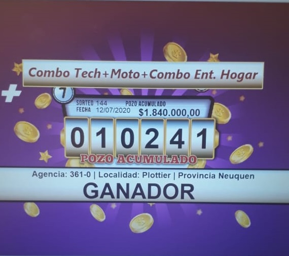 El cartón triunfador fue vendido en la Agencia 361 de Plottier, de acuerdo a lo indicado esta tarde por el Instituto de Juegos de Azar de la Provincia del Neuquén (IJAN).