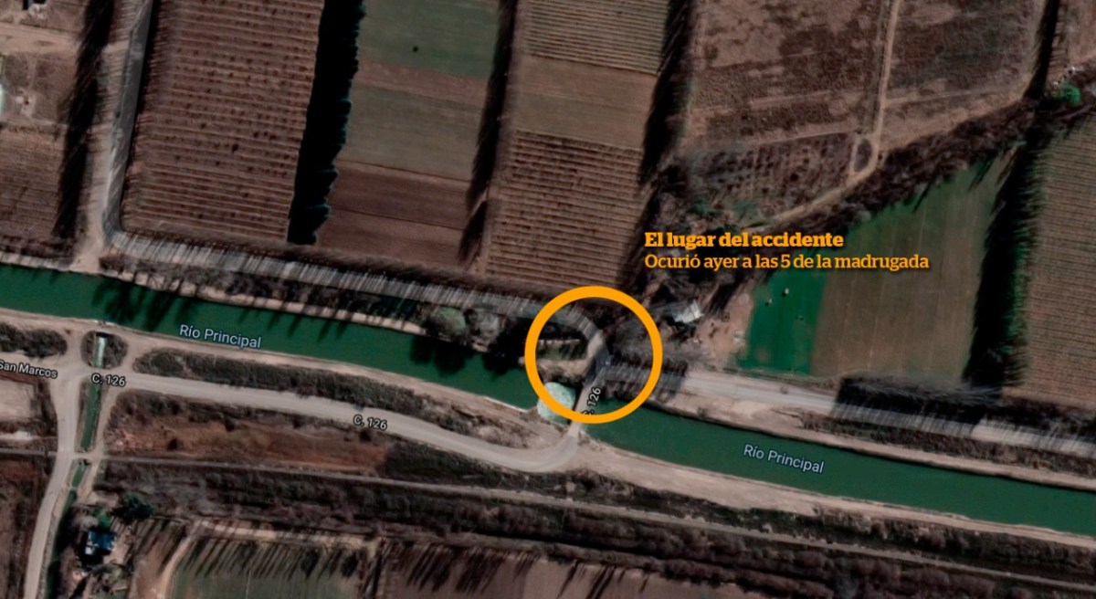 Muñoz contó que a esa hora se despertó sobresaltado por el impacto del vehículo contra un montículo de cemento de un canal secundario que sale desde esa zona. Allí el vehículo perdió dos de los neumáticos para luego caer al canal principal de riego.